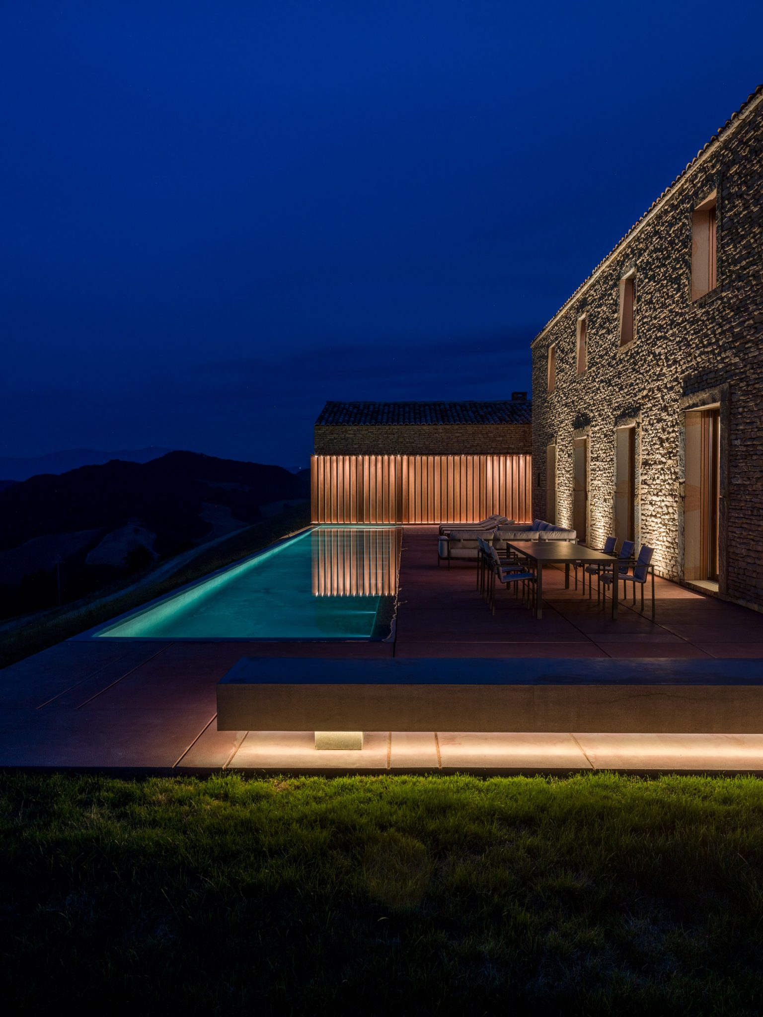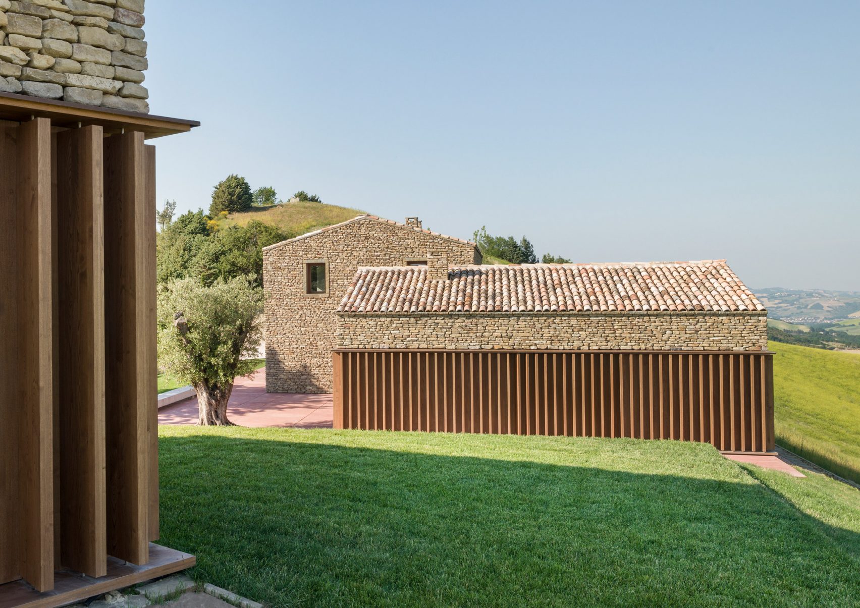 There is a distinctive contemporary aesthetic to the AP House but it certainly borrows heavily from the sort of houses that may have been found in the region in years gone by and we’re loving how carefully each element of the design has been considered here at Coolector HQ. The site where AP House is located was previously occupied by a rural hamlet which actually dates all the way back to Medieval times. Rimini-based,GGA Architects, placed the new structures for the property on top of the ancient remains and made a compelling connection to them by adding a basement level which has been buried within the hill itself.