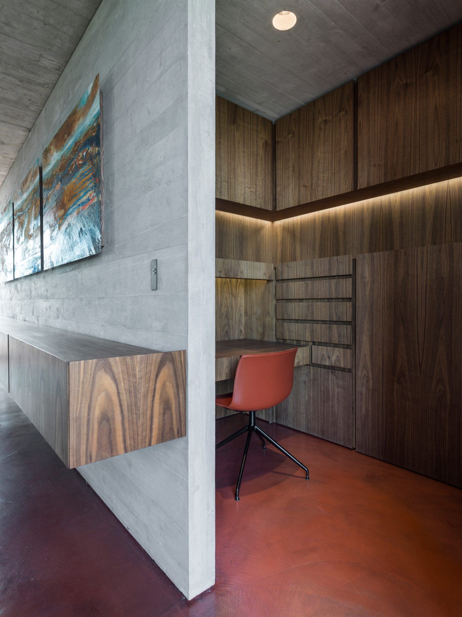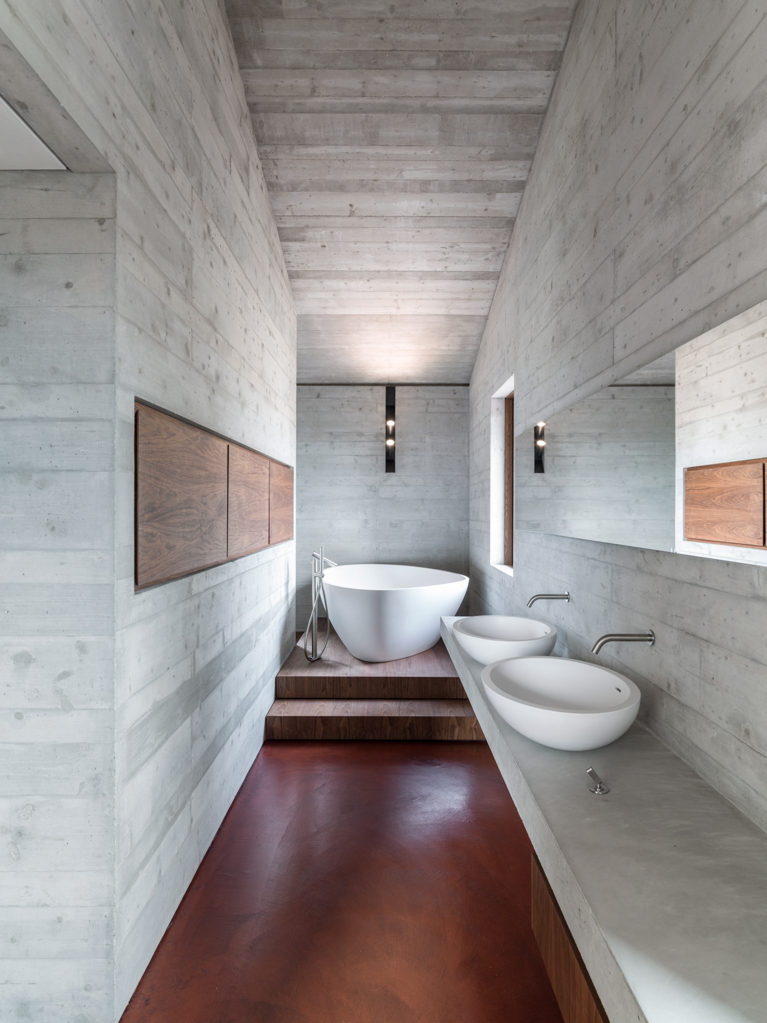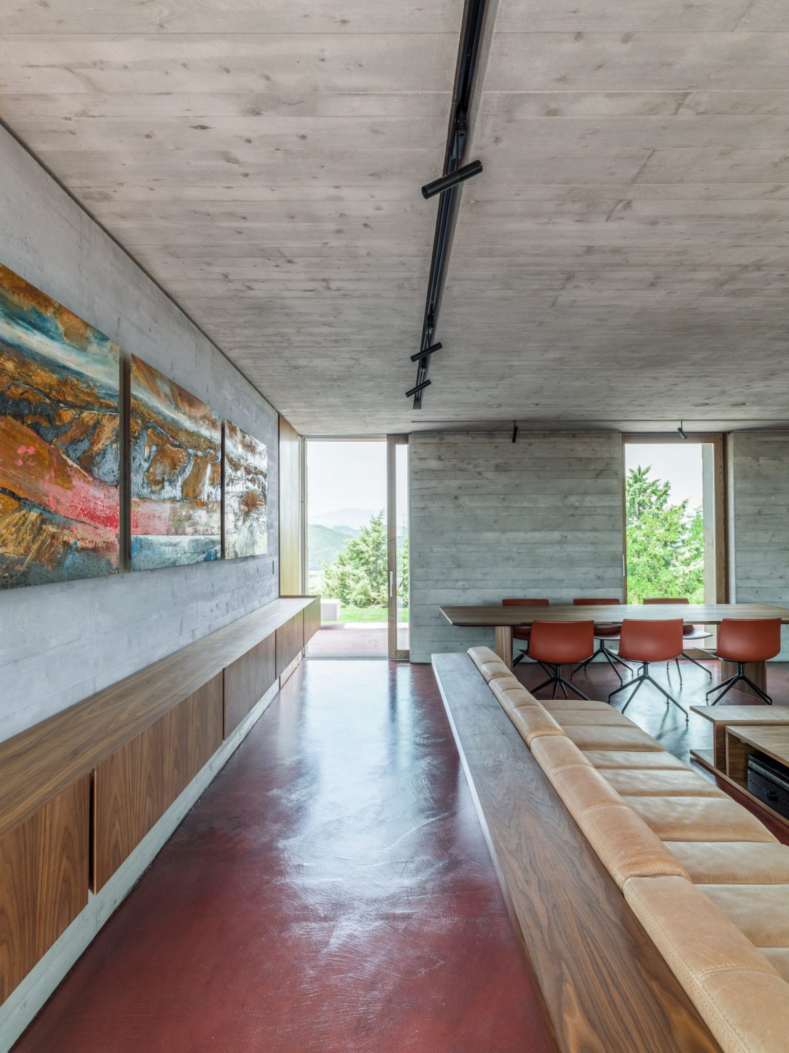 The AP House from GGA Architects fits in perfectly with its countryside surroundings and doesn’t impact upon it at all by ensuring it has an elegant, muted exterior that isn’t at odds with the picturesque setting of the property. It has two main buildings which are situated on a red-pigmented concrete platform which forms a welcoming terrace with amazing views of the surrounding vistas. The coloured concrete delivers an eye-catching contrast to the hues of the verdant hillside and the blue skies and luxurious swimming pool.
