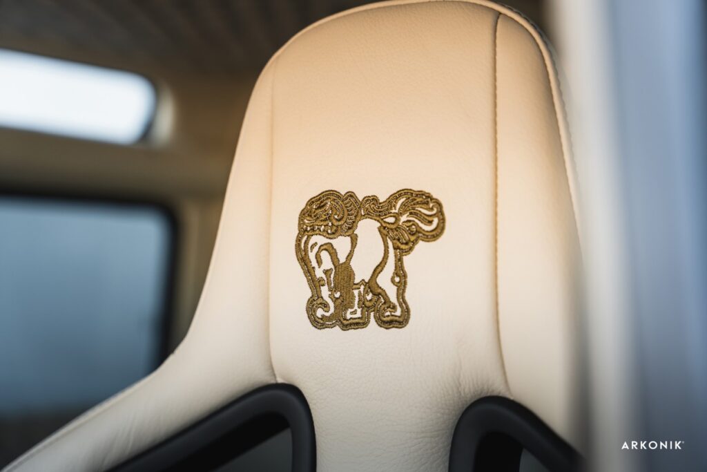 Step inside the FU Dog Defender (£227,500), and you’re greeted by an interior that exudes opulence and sophistication. The seating trim is adorned with Manilla leather featuring a diamond stitch pattern, providing a sumptuous feel. The front-row seats are RECARO® Cross Sportster CS, ensuring both comfort and support for long journeys. Storage is enhanced with a premium lock box equipped with a 12v port, perfect for keeping valuables secure.