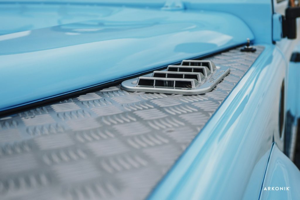 Arkonik performs a full restoration on the Defender whilst retaining as much of the original vehicles as possible, to render a ‘better than new’ vehicle tailored to clients’ specifications. The Reef D90 is definitely one of their most vibrant and striking builds to date and ideally suited to the laid back beach lifestyle of the new owners.