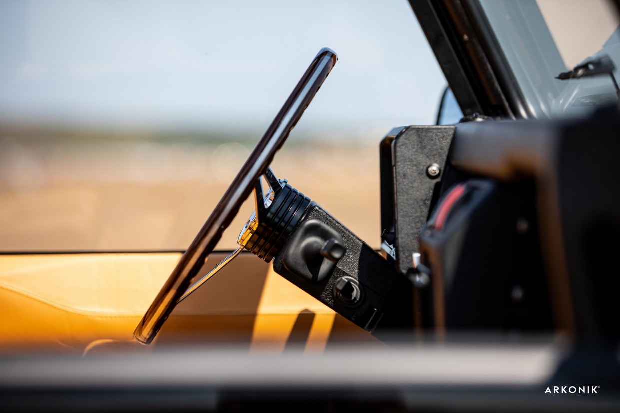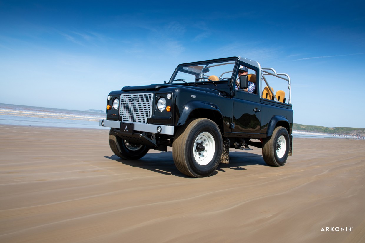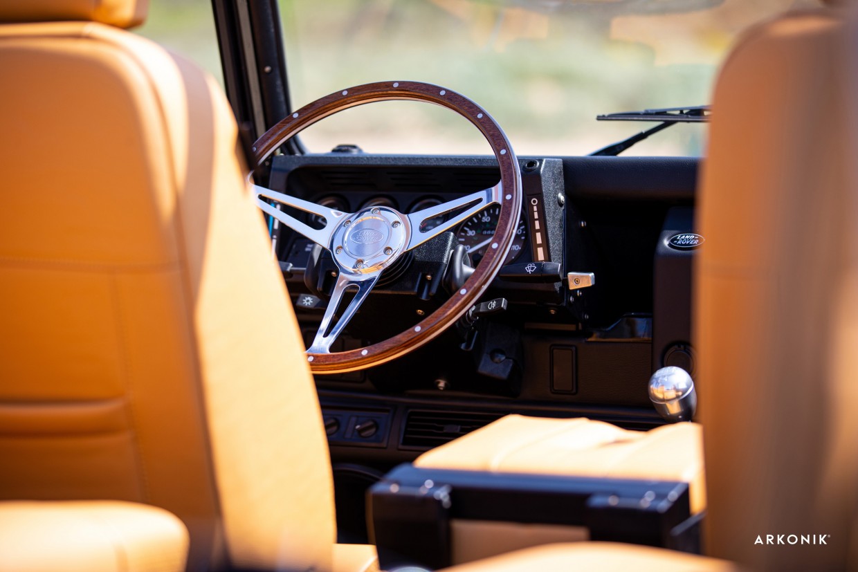 Boasting a highly classic look with its silver Heritage grille, bumper and frame to offset the gleaming Java Black paintwork, the So-Cal from Arkonik is a real sight to behold. The interiors positively excel with the Camden Woven interior trim and wood-rimmed steering wheel enhancing the surf vibes of this ultra-stylish D90. With the Tan soft-top removed, the interior is fully revealed for all to see. Puma style seats upfront and tip-seats in the rear have been trimmed in Camden Supersoft leather by Ruskin Design®, and include woven detailing throughout.