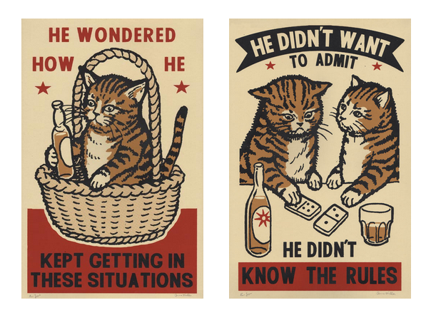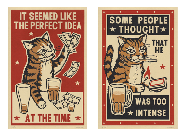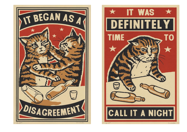 Whether you opt for the magnificent matchboxes or one (or likely more) of the Arna Miller Cat Prints, you’ll be getting a great piece of artwork relating to our favourite four legged friends. With a somewhat serious historical looking aesthetic and matter-of-fact text adding an air of propaganda style to proceedings, these ridiculous pieces of artwork do a great job of finding comedy in imagining animals undergoing the same human emotions, ambitions, and failures as we do day in, day out.