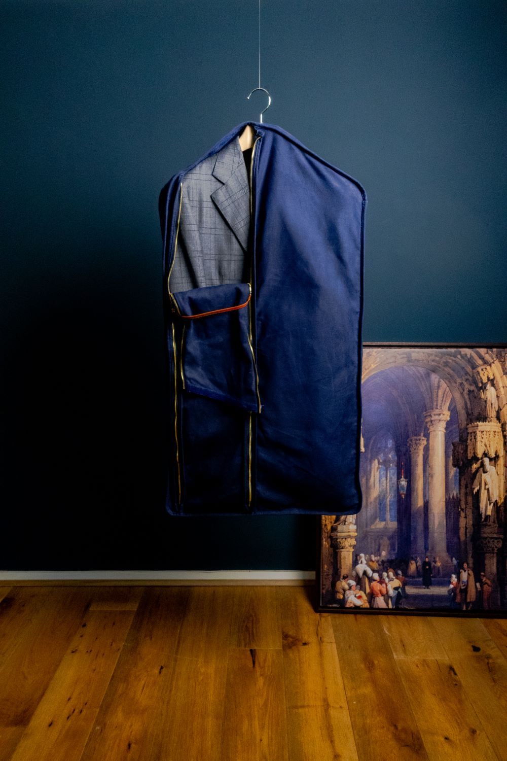 Boasting a unique dual-zip opening that allows for effortless insertion and retrieval of your luxury garments, whilst the leather attachment allows both zips to be opened in one simple action. Cleverly designed to help avoid garment wrinkling: the three buttonhole openings on the Signature Garment Bag allow for bespoke suits to be kept on their hangers. Reinforced gussets provide structure to protect against cramping in the closet the inter-fibre rigidity of Arterton’s fabric ensures that large water droplets are not able to penetrate past the barrier, whilst air molecules are small enough to pass. Want to protect and carry your suit in style? This is the product for you.