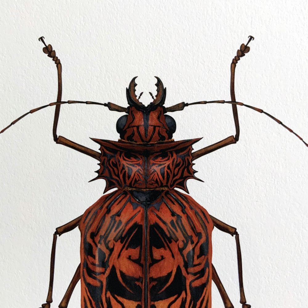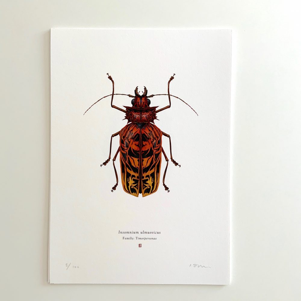 Wilkinson’s first series of artwork, this majestic looking Arthropoda Iconicus collection, is an extensive series of artworks illustrating imaginary insects (and a few other arthropods) which hold within them a resemblance to some specimen of popular culture – a film or TV character, a vehicle, a building, a shoe or a bag – and it’s great fun deciphering which member of the Star Wars galaxy or horror film franchise has been captured in his creation.