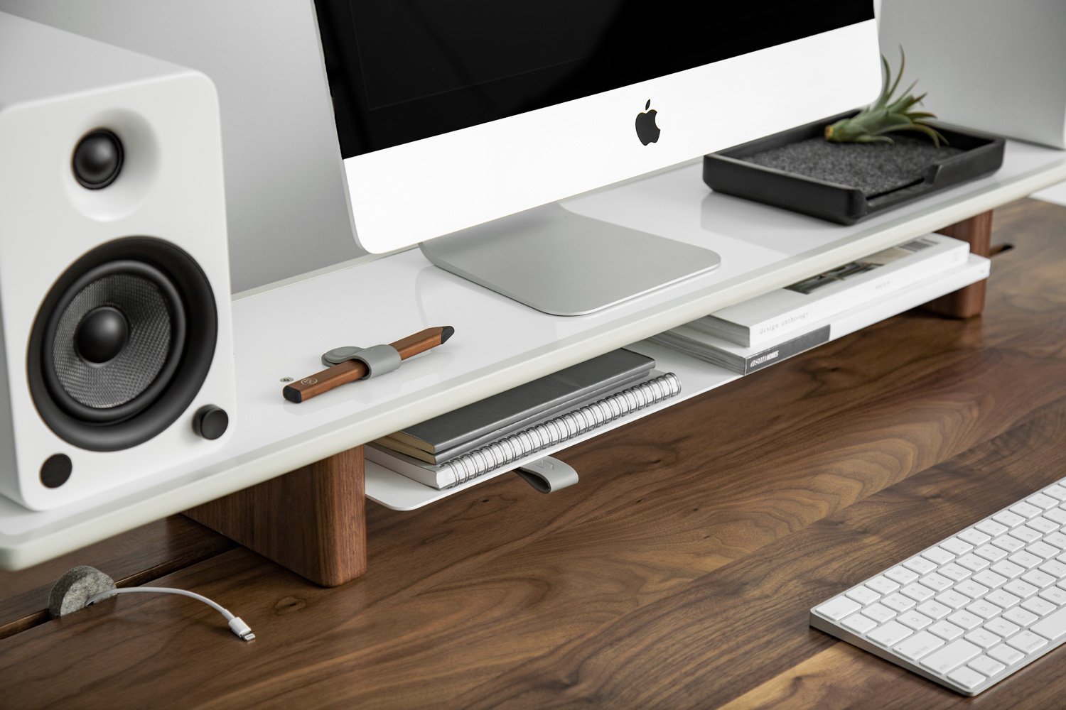 An elevate screen is much better for your posture but gone are the days of just shoving some books under there. Ramp up the classiness of your workspace with the excellent looking Artifox Lift ($220) which is both eye-catchingly stylish and provides another layer of functionality to your desk. It provides multi-level storage to display monitors, notebooks, plants and more. Designed with the DESK 02 in mind, but works with nearly any surface. Pair with PEGS and BANDS for endless magnetic styling options. The lower shelf holds a 15” macbook, keyboard, mouse, and notebooks. ($220)