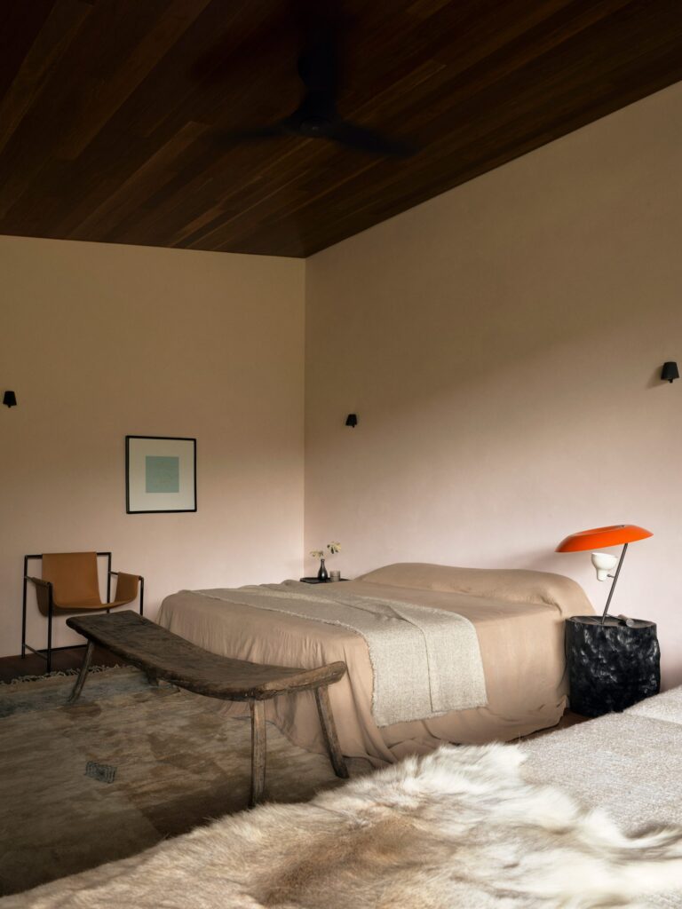 While the timber ceilings continue, pulled into focus by light from clerestory windows, the bathrooms offer a softer, more ethereal vibe with pale pink and cream plaster walls and cool marble fittings.