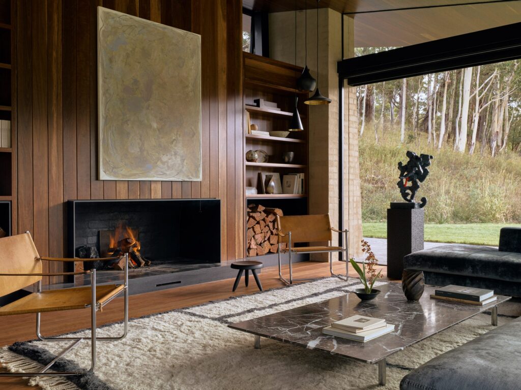 Of course, a retreat in the Victorian Alps demands a connection to the outdoors, and the Howqua River Lodge delivers in spades. A continuous terrace wraps the home’s perimeter, expanding to form a large dining area to the north.
