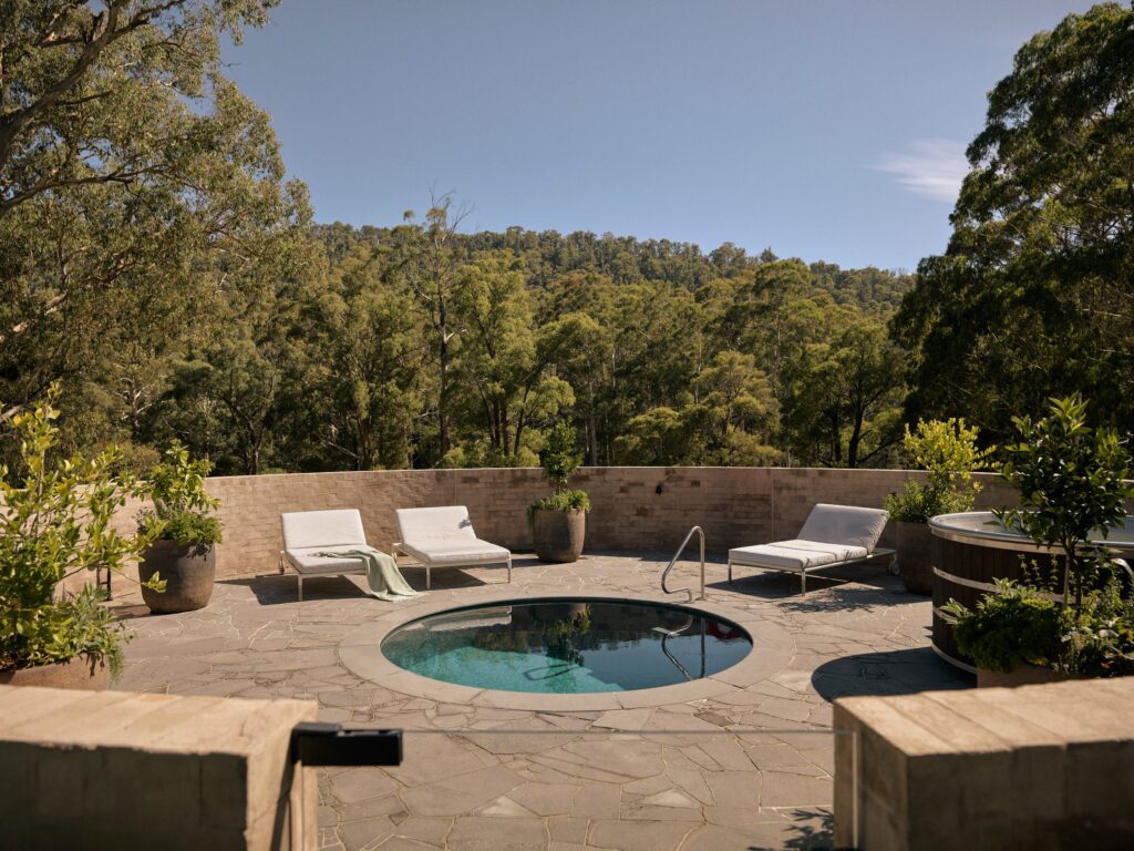 For those chilly alpine evenings, a fire pit sits alongside a circular, stone-paved terrace complete with a plunge pool and daybeds. Tucked away near the bedroom volumes, a sauna and cold plunge pool offer the ultimate wellness experience, perfect for recovering after a day exploring the bush.