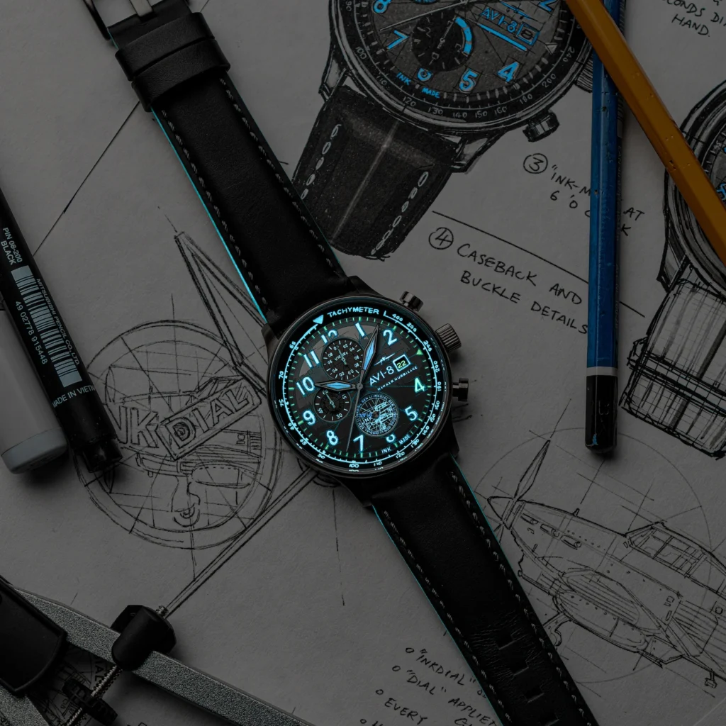 This new collaboration is a renewed partnership between AVI-8 and Ben Li, who first began sketching for the brand years ago. Following the success of his previous limited-edition artwork for the Hawker Hurricane Classic Chronos packaging, it was only fitting that the collaboration took a step further this year, resulting in a watch that truly embodies Inkdial’s artistic journey. The fourth anniversary of Inkdial is celebrated in style, with a special touch that fans are sure to appreciate: the number “4” on the dial glows in a distinctive green lume, symbolizing Ben’s journey in the world of watch illustration.