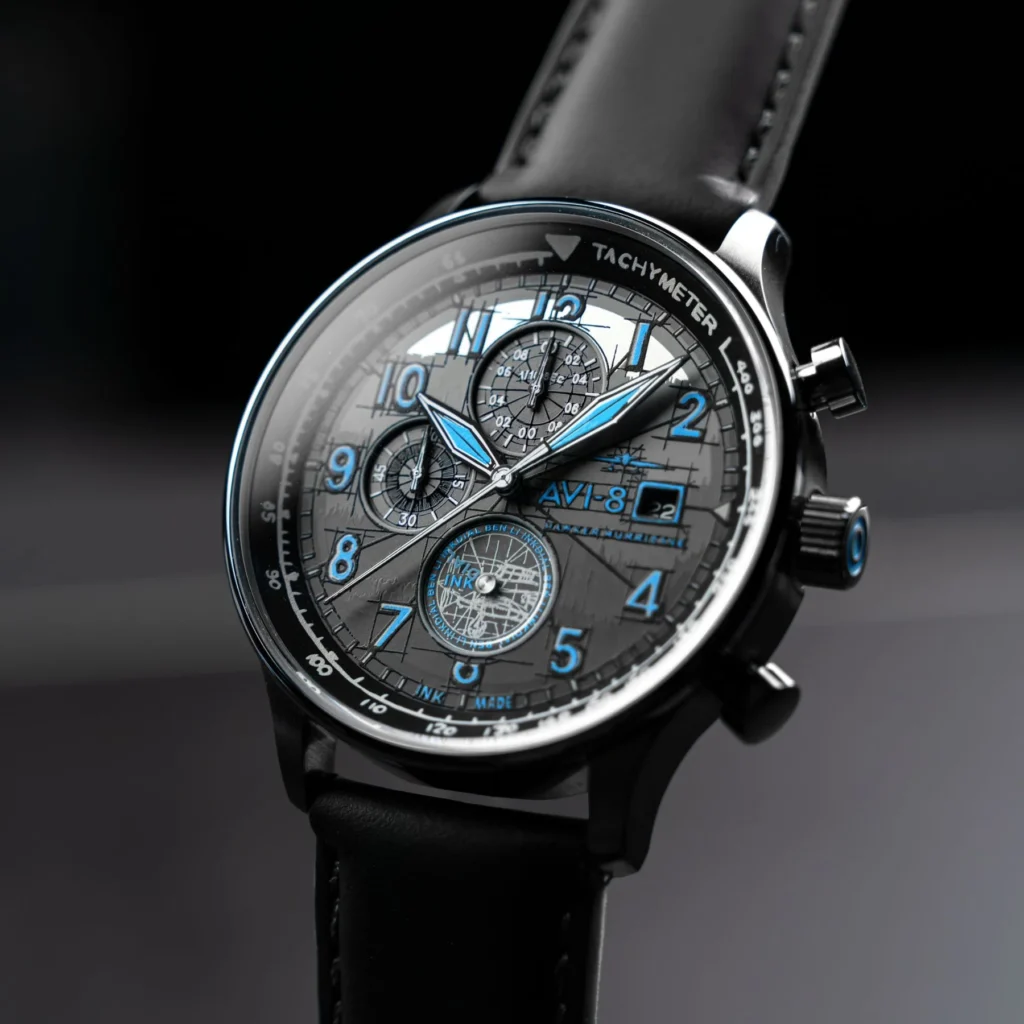 At first glance, the Inkdial Chronograph is a striking timepiece that offers the sort of bold aesthetics we’ve come to expect from AVI-8, while still feeling fresh and unique. The grey dial serves as the perfect canvas for Ben’s design influences, with printed indices infused with Japan Super Luminous that ensure optimal visibility. The 43mm stainless steel case gives the watch a substantial presence, yet the 50mm lug-to-lug distance and 14mm thickness mean it remains comfortably wearable. With a weight of 93 grams, it strikes the perfect balance between durability and comfort.