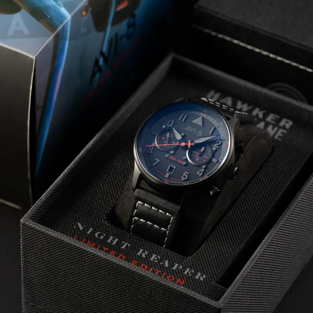 It’s hard not to be impressed with the stealthy style of the Night Reaper Limited Editions from AVI-8 which is an exclusive capsule within the Hawker Hurricane family of timepieces. Each one of the three is inspired by Kuttelwascher’s iconic Hurricane JX-E (serial BE581) and they are meticulously crafted in deep black hues. The Classic Chronograph and Carey Dual Time editions are limited to 170 pieces each, while the Clowes edition is limited to just 120 pieces – so, if you like what you see, make sure you move quickly to secure one for your wrist.