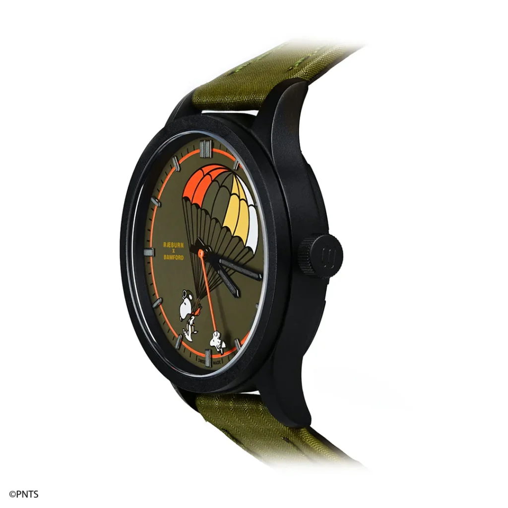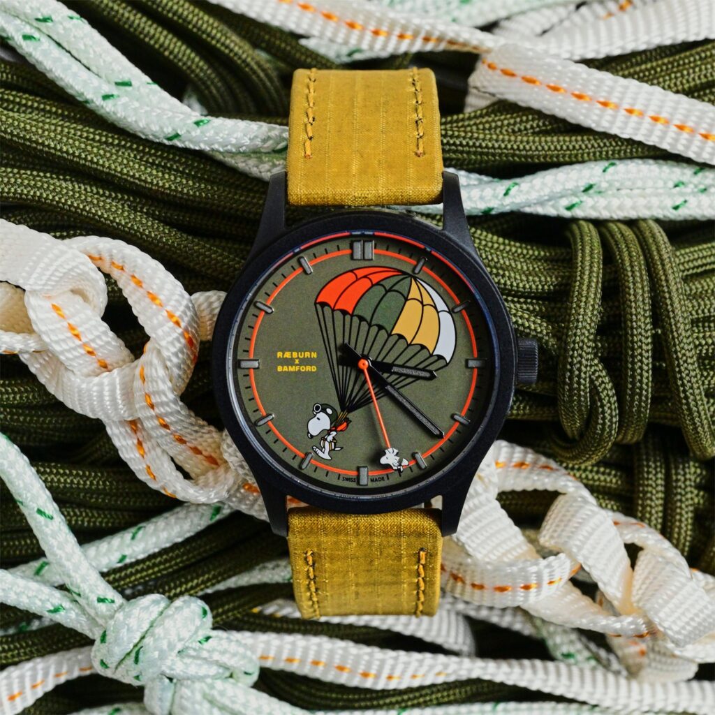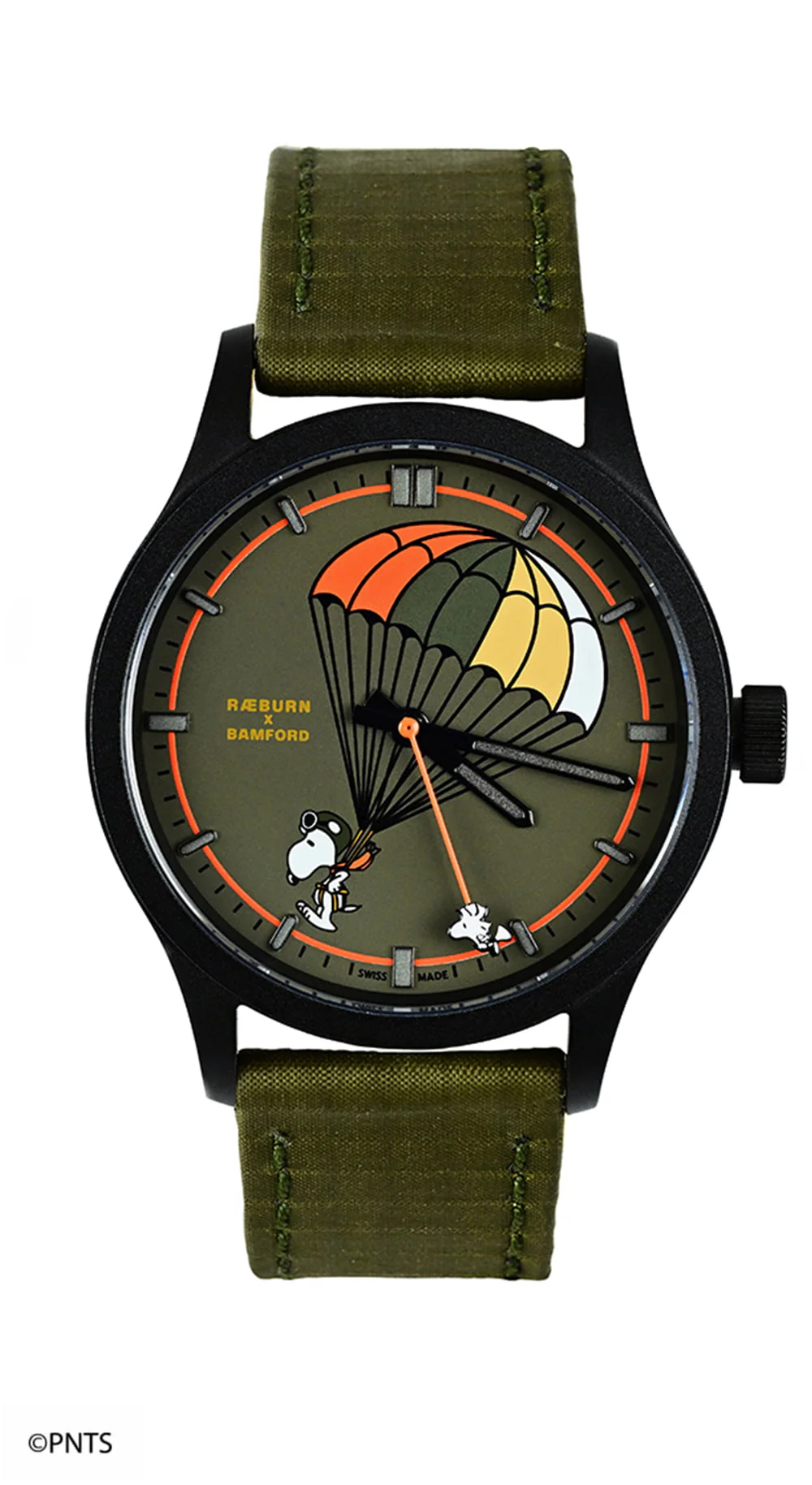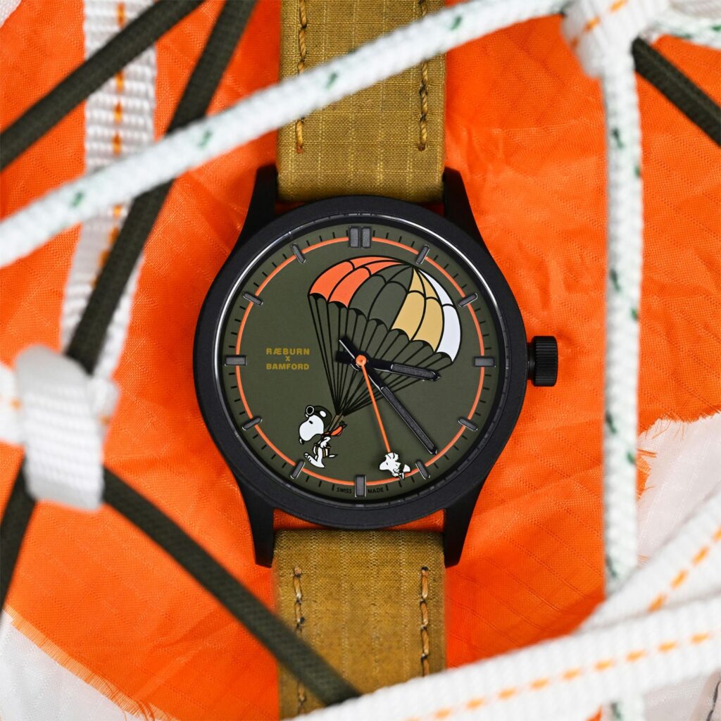 The Bamford x RÆBURN Snoopy B80 watch (£1350) exudes a captivating earthy colour palette, inspired by RÆBURN’s renowned parachute logo. The dial artwork is playful and nostalgic, featuring Snoopy gracefully descending to Earth with the aid of RÆBURN’s authentic pilot’s parachute. This whimsical design not only adds a touch of charm but also symbolizes the shared mission of Bamford and RÆBURN to champion responsible design and art.