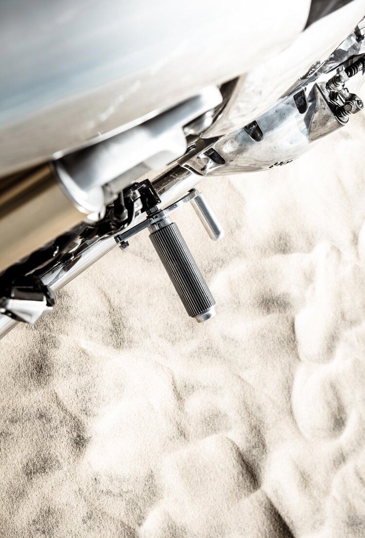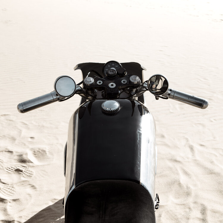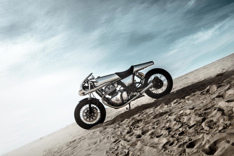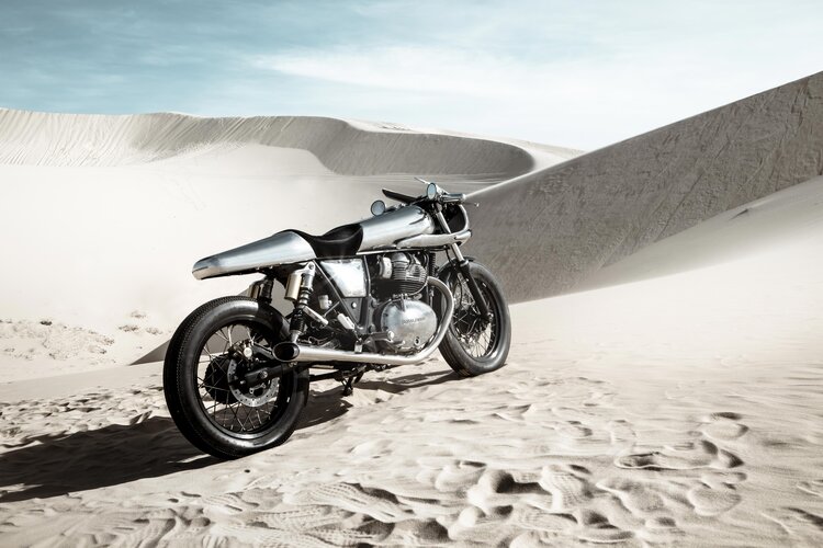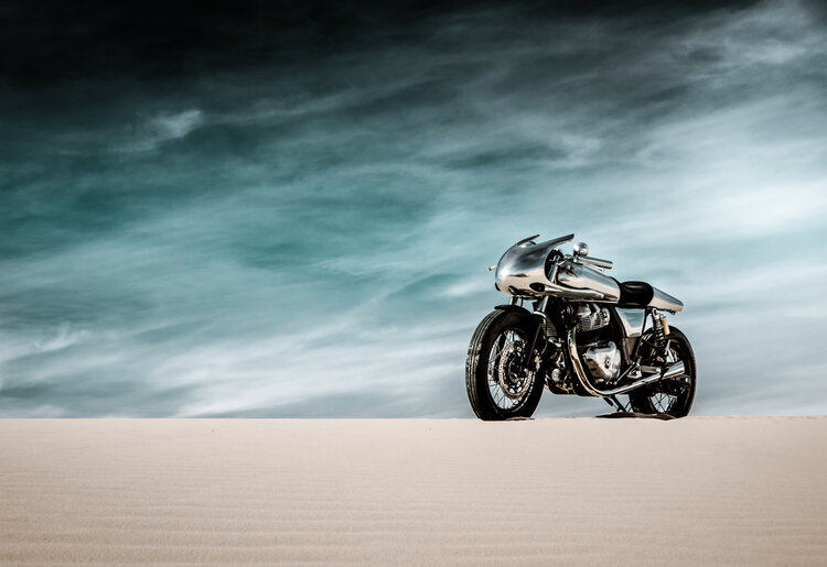 The Bandit9 x Royal Enfield Jaeger Motorbike has taken half a year to complete from the original concept right through to manufacturing, photography and filmography. To deliver its striking form, the main challenge was to extend the wheelbase of the royal enfield continental GT 650 without needing to alter the frame; the structure needed to remain the same so that the body kits could be universally fitted on to motorbikes by the clients. The end result also helps shave off 35lbs from the original weight making this a lightweight marvel.