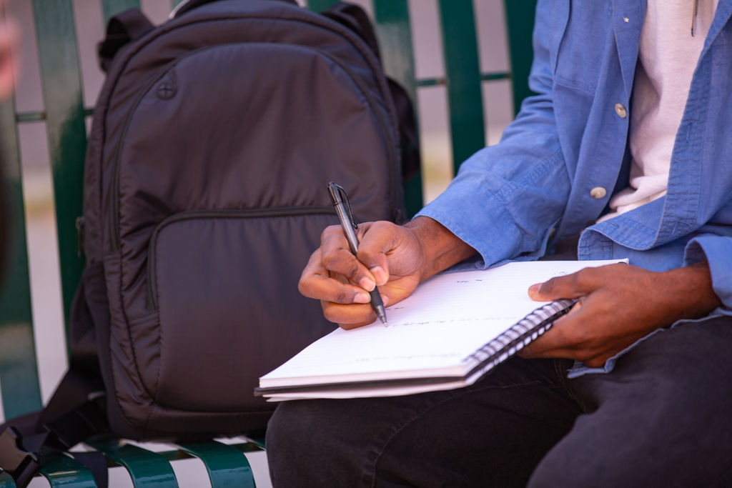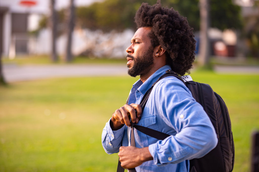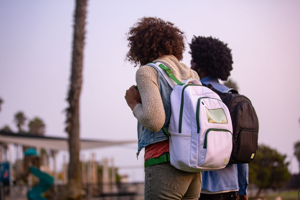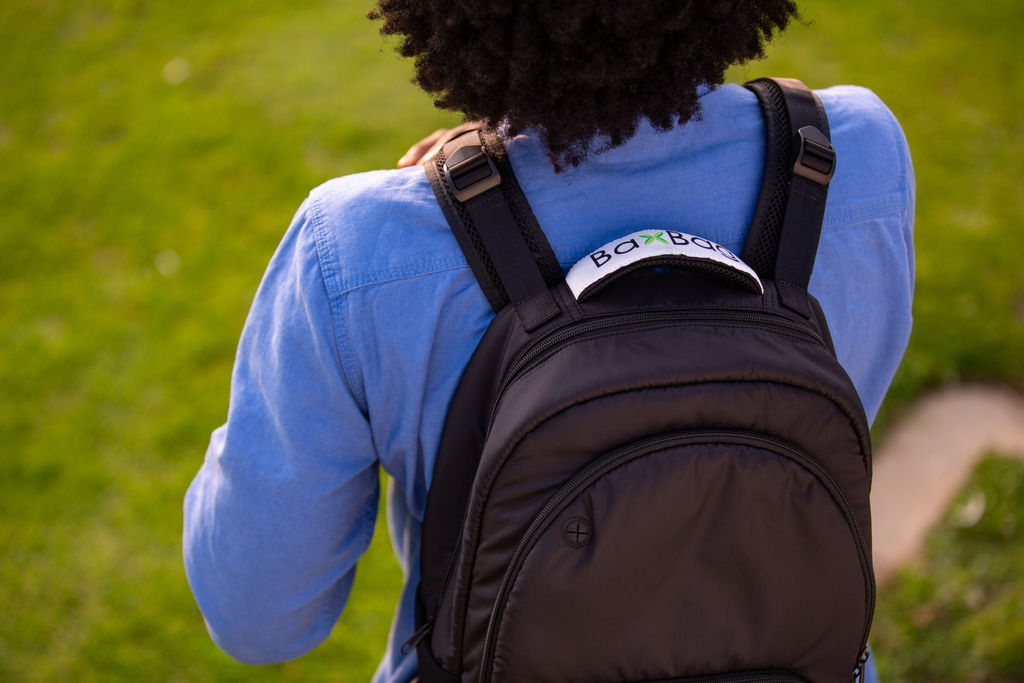 There are four adjustable straps — two on top and two on the bottom – with the BaxBag Vegan Backpack. By pulling the bottom two straps, you can alter the length of the green nylon straps attached to the white foam shoulder straps. The green nylon straps also go through the inside backing of the bag which let you adjust the white foam shoulder straps. You can pull the white foam shoulder strap inside of the bag, shortening the length of the shoulder strap entirely. The top two adjusters keep the shoulder straps in place.