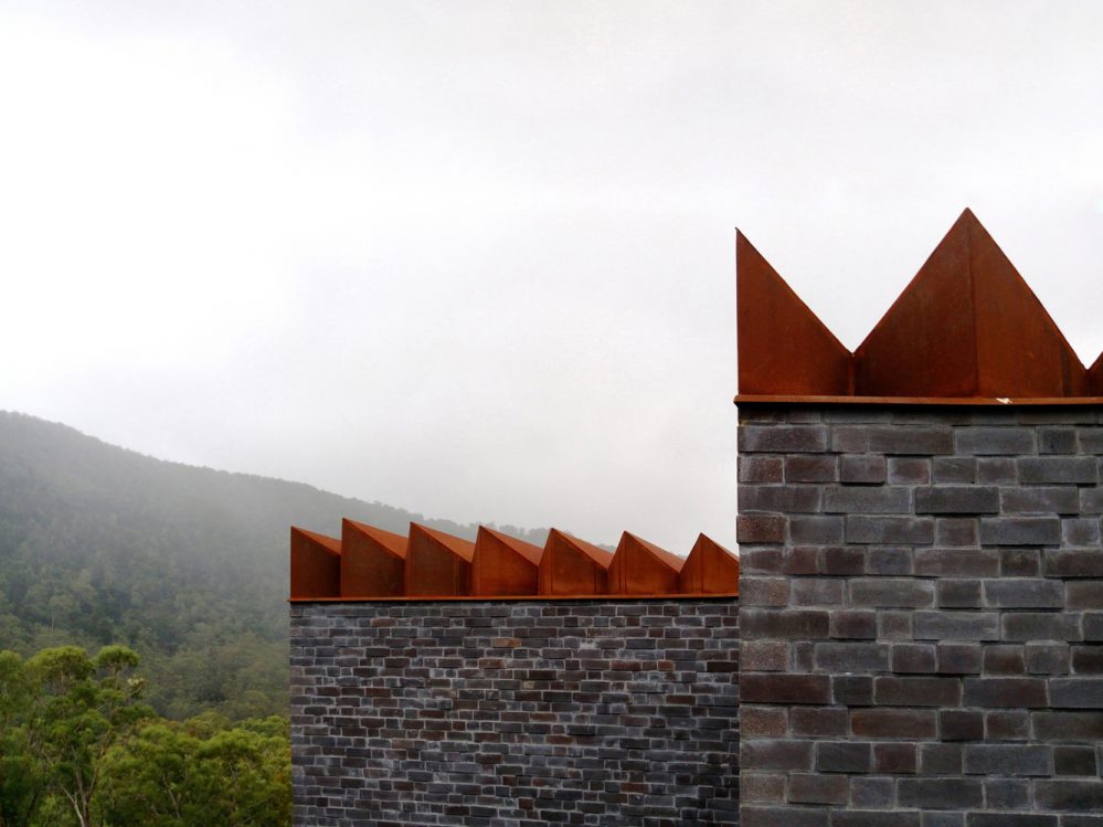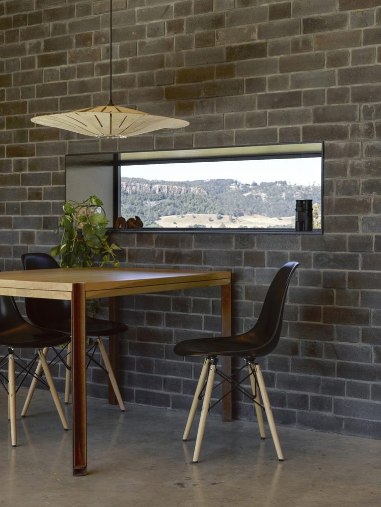This weekend retreat gives the owners the opportunity to relax and unwind in some of Australia’s most mesmerising bushland and it has been so cleverly designed so as not to detract from its unique, wilderness setting. It boasts monolithic brick blade walls which are continued inside, and triangular roof pleats which penetrate the northern glass facade, with their patina resonating with the bark of surrounding gum trees.
