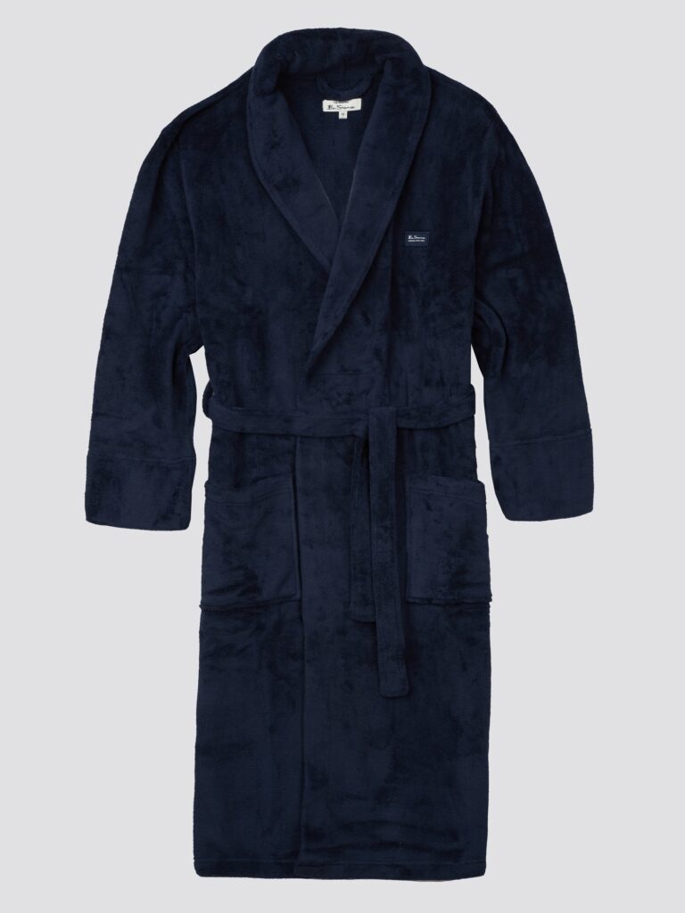 Lounge in style with Ben Sherman. This navy blue men’s fleecy bathrobe features a matching tie belt, finished with the original Ben Sherman branding.