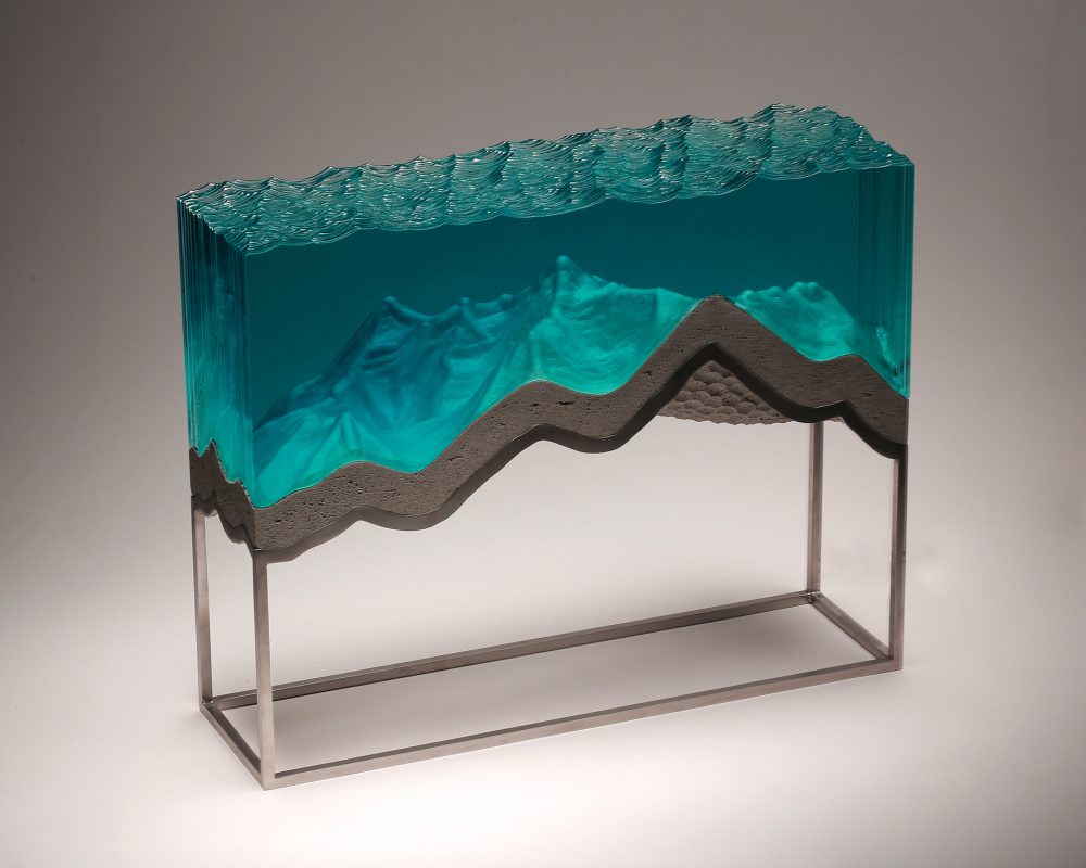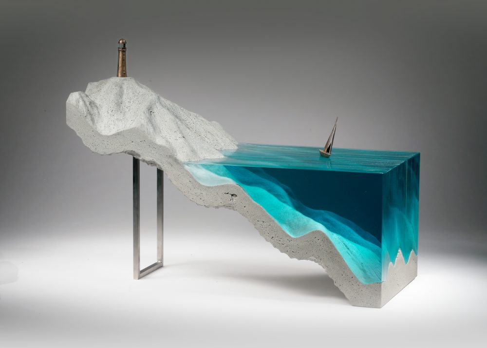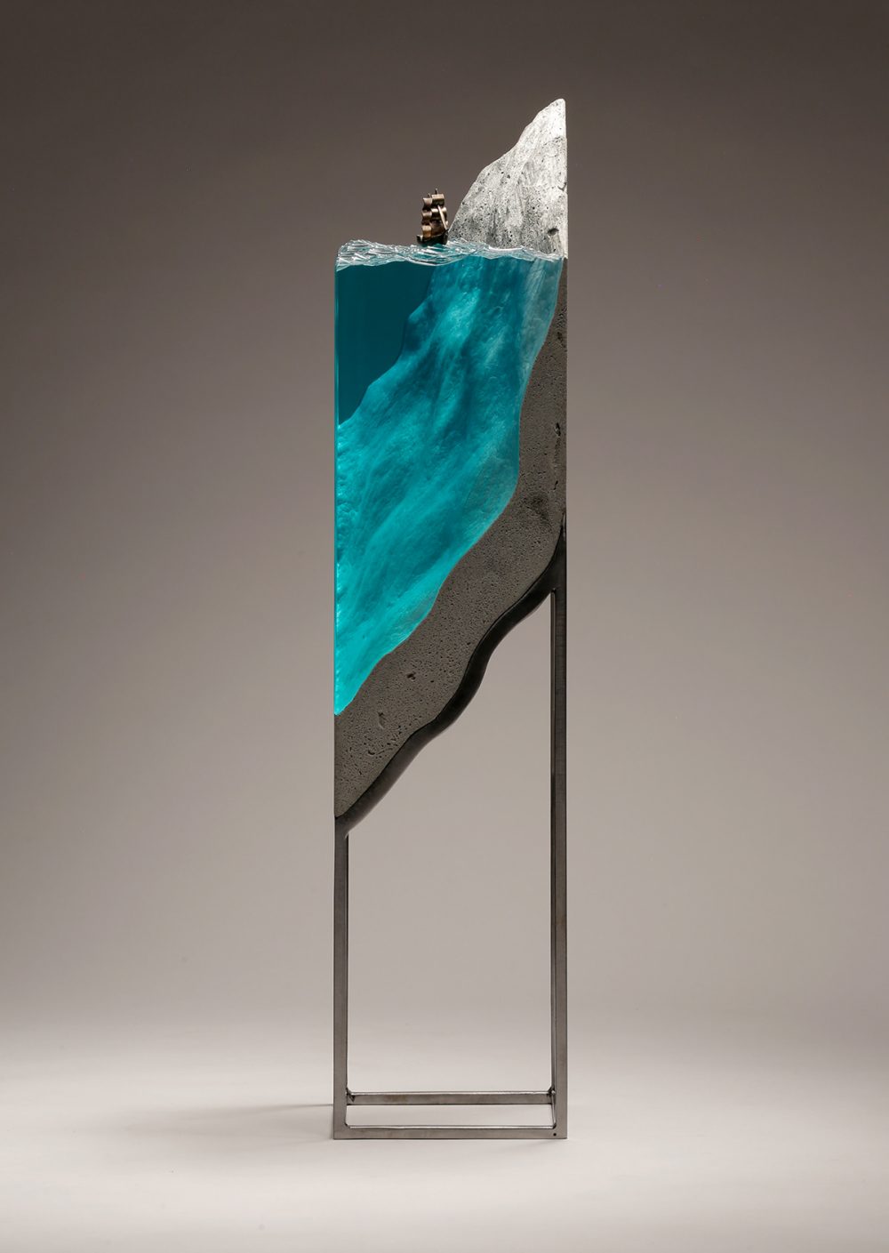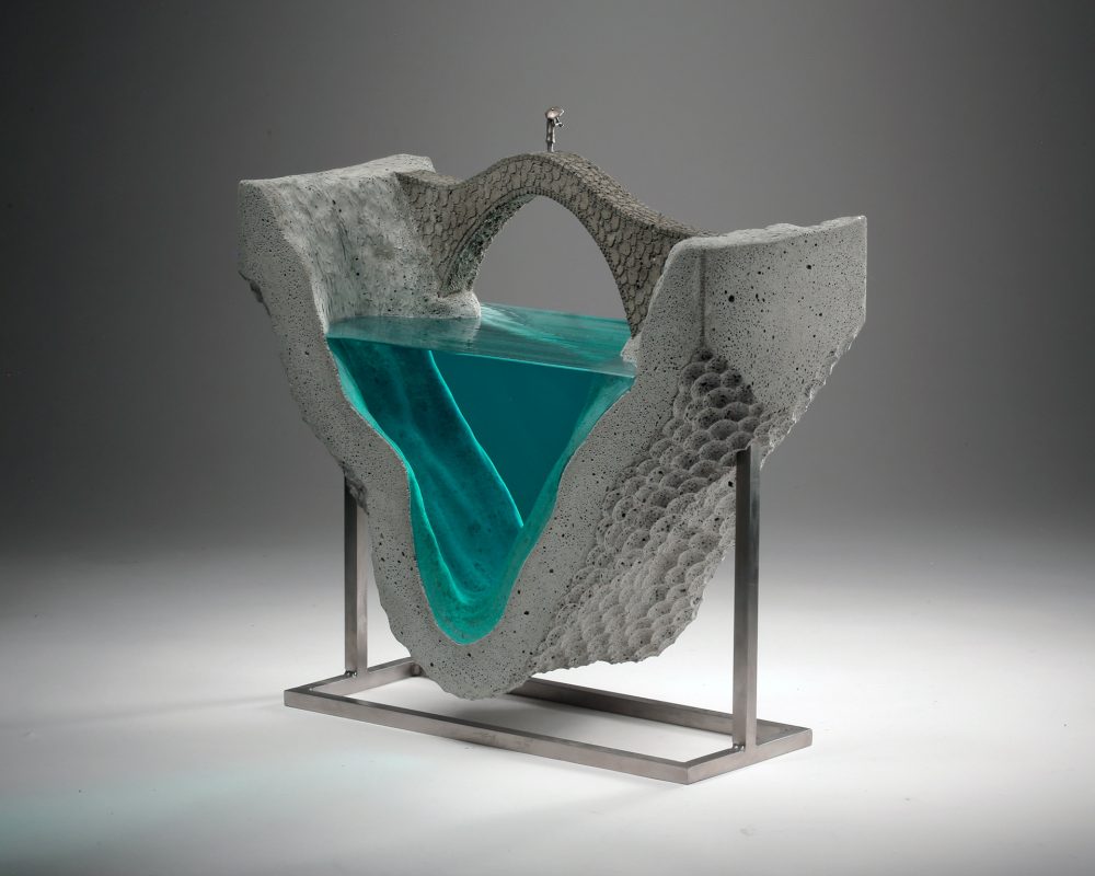 All the sensational Broken Liquid Sculptures from Ben Young explore the use of industrial materials to compliment the organic glass shapes that form the basis of his designs. He likes the idea that concrete is a basic construction material, and also the physical and visual contrasts between the textures and colours of both materials. Clearly influenced by the ocean and bodies of water – the concrete forms have become an essential part of his art forms as have the small bronze carvings which he sculpts initially from wax and uses to help portray the narrative suggested by his landscapes.