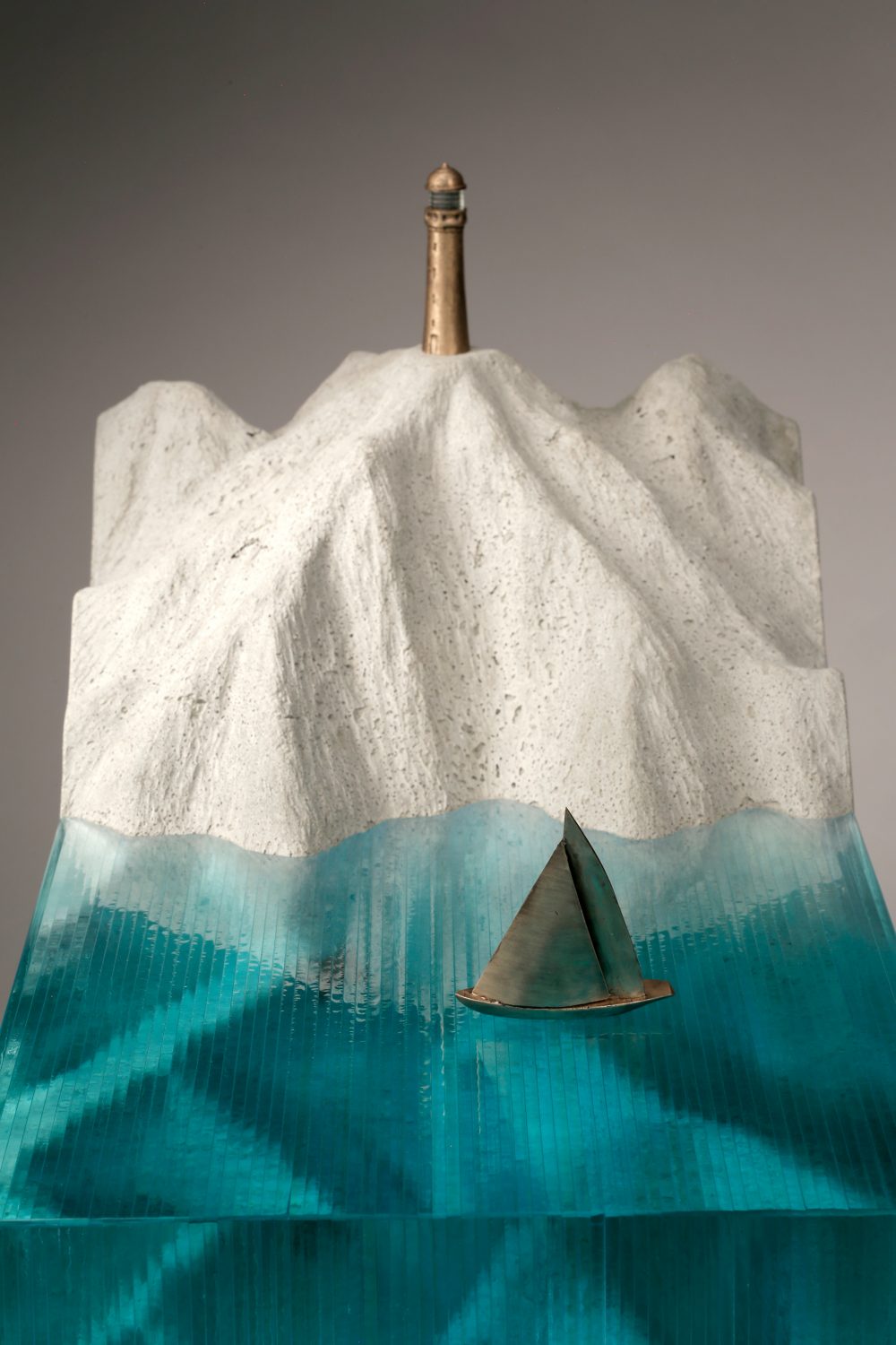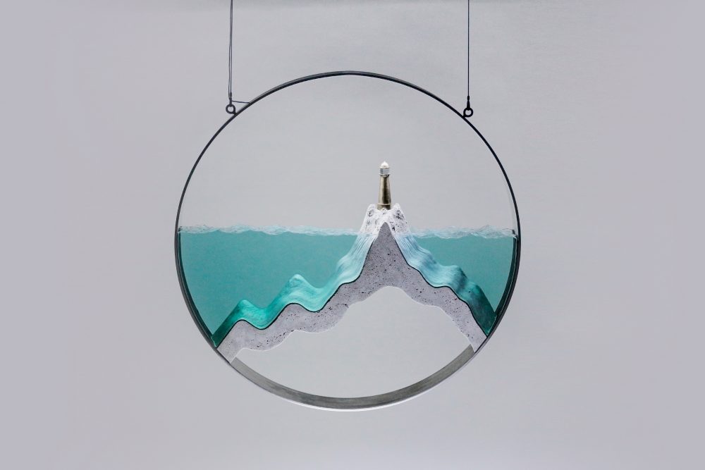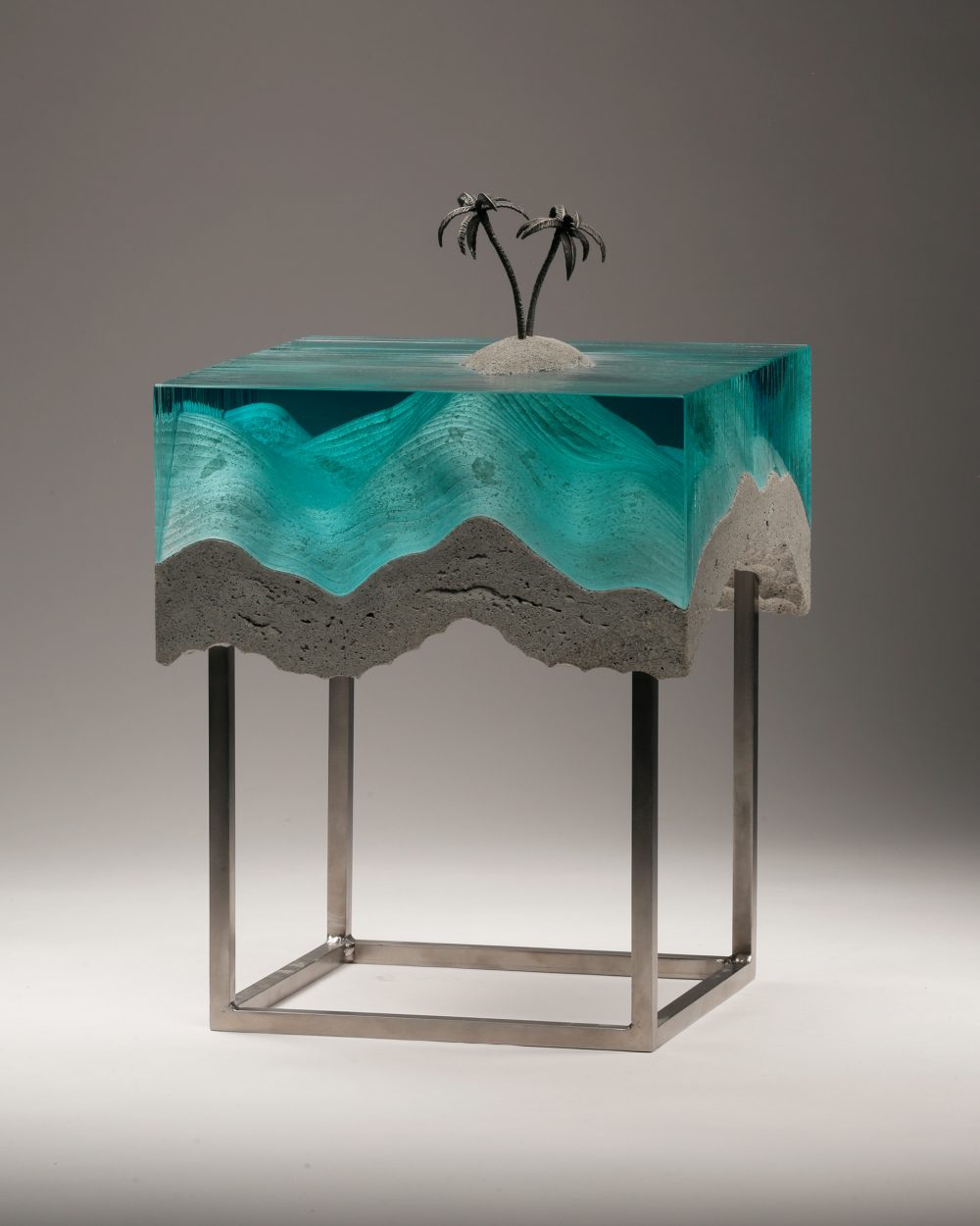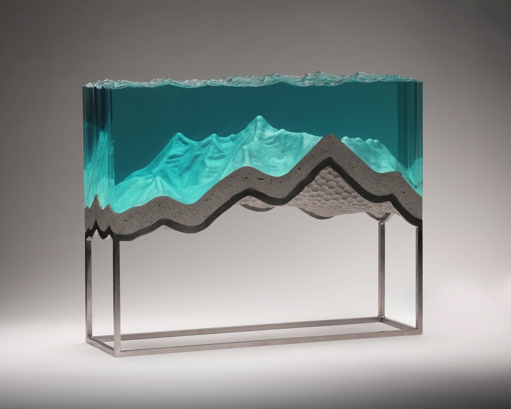 All the sensational Broken Liquid Sculptures from Ben Young explore the use of industrial materials to compliment the organic glass shapes that form the basis of his designs. He likes the idea that concrete is a basic construction material, and also the physical and visual contrasts between the textures and colours of both materials. Clearly influenced by the ocean and bodies of water – the concrete forms have become an essential part of his art forms as have the small bronze carvings which he sculpts initially from wax and uses to help portray the narrative suggested by his landscapes.