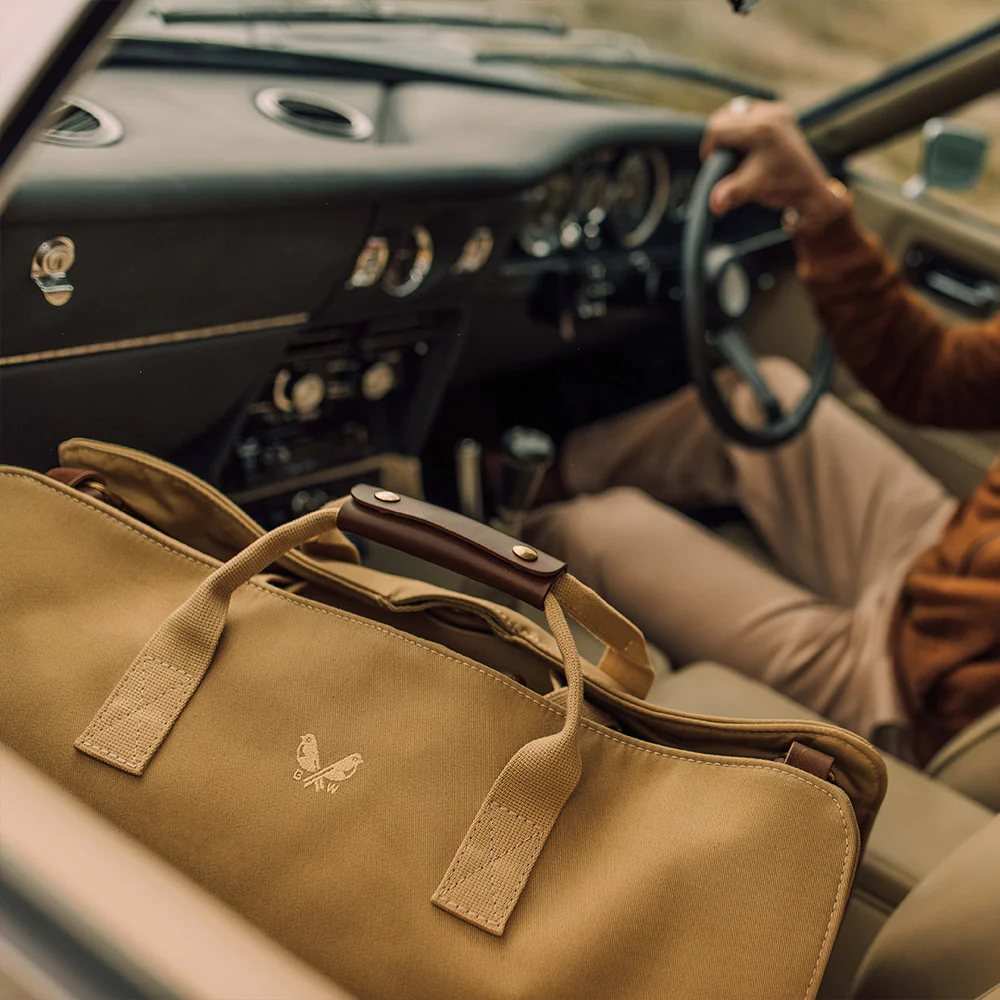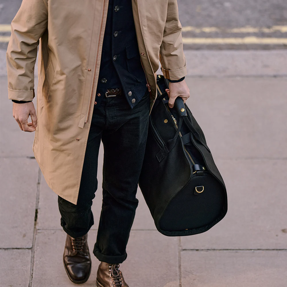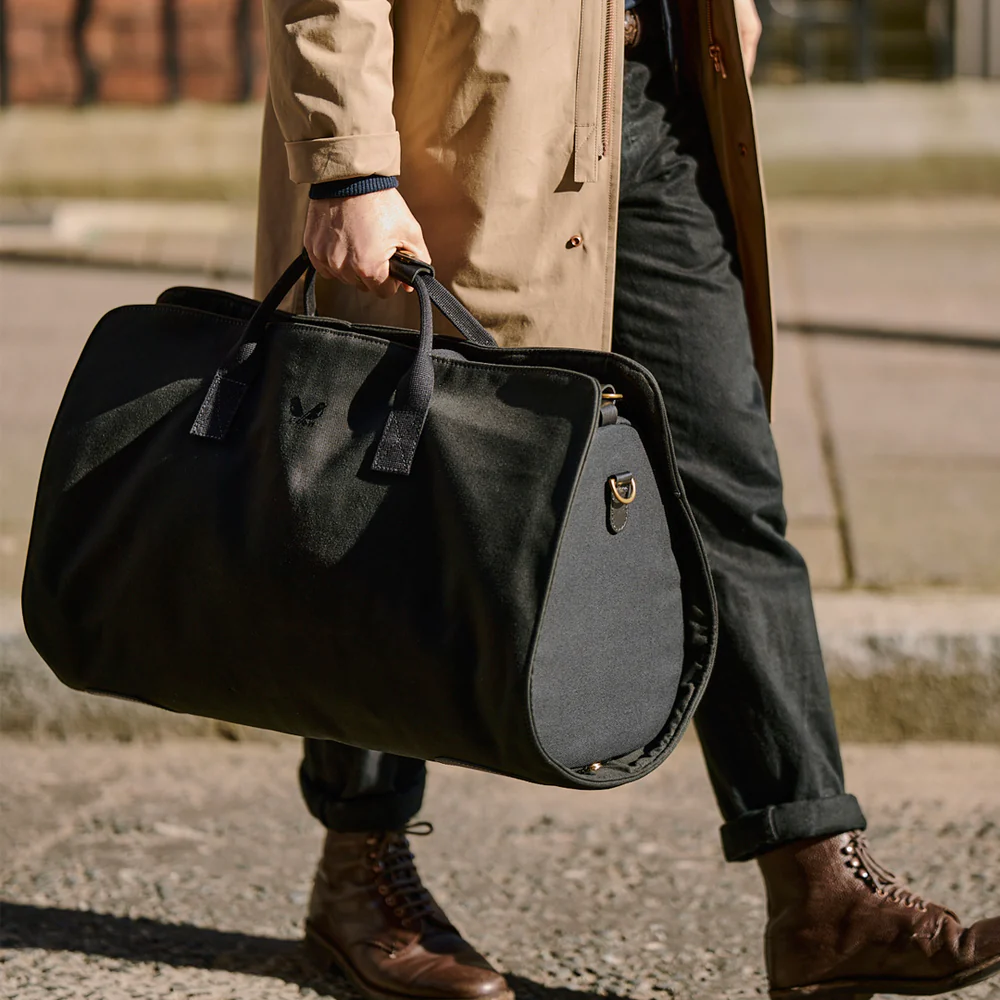 The exterior of suit carrier is crafted from 24oz British dyed, waterproof cotton canvas and the holdall is made from lightweight British dyed and proofed 18oz canvas twill. It is classy from top to bottom and has solid brass hardware welded in London alongside YKK golden brass zips.