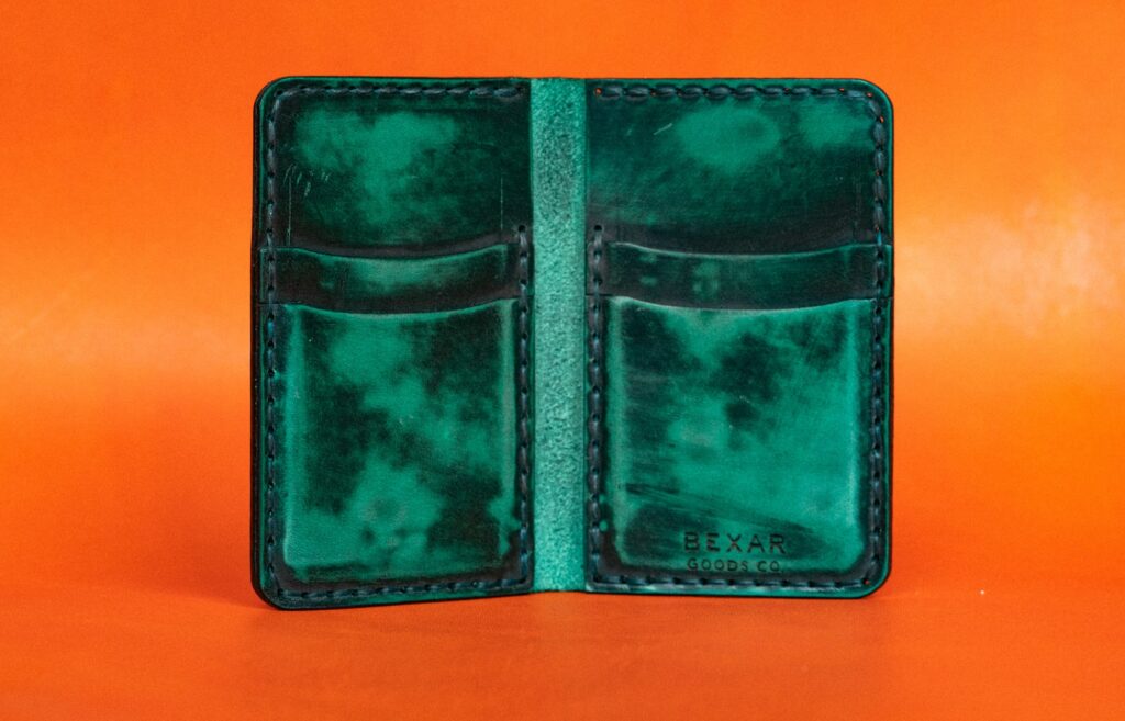 The Vertical Card Wallet from Bexar Goods Co is the ideal compromise between the classic bifold style and a simple card wallet. It boasts a highly unique design that can comfortably fit in either the front or back pocket. The layout of the four card pockets allow for cards to be easily picked out, and the two stash pockets are great for storing paper money. Each one is saddle stitched by hand, joining each leather piece together with a robust poly cord thread. The saddle stitch technique has been favoured for centuries by expert leather workers, and has a distinct durability benefits when compared to the lock stitch technique used by machine stitching. After a stand out wallet for your EDC line up? You’ve just found it.