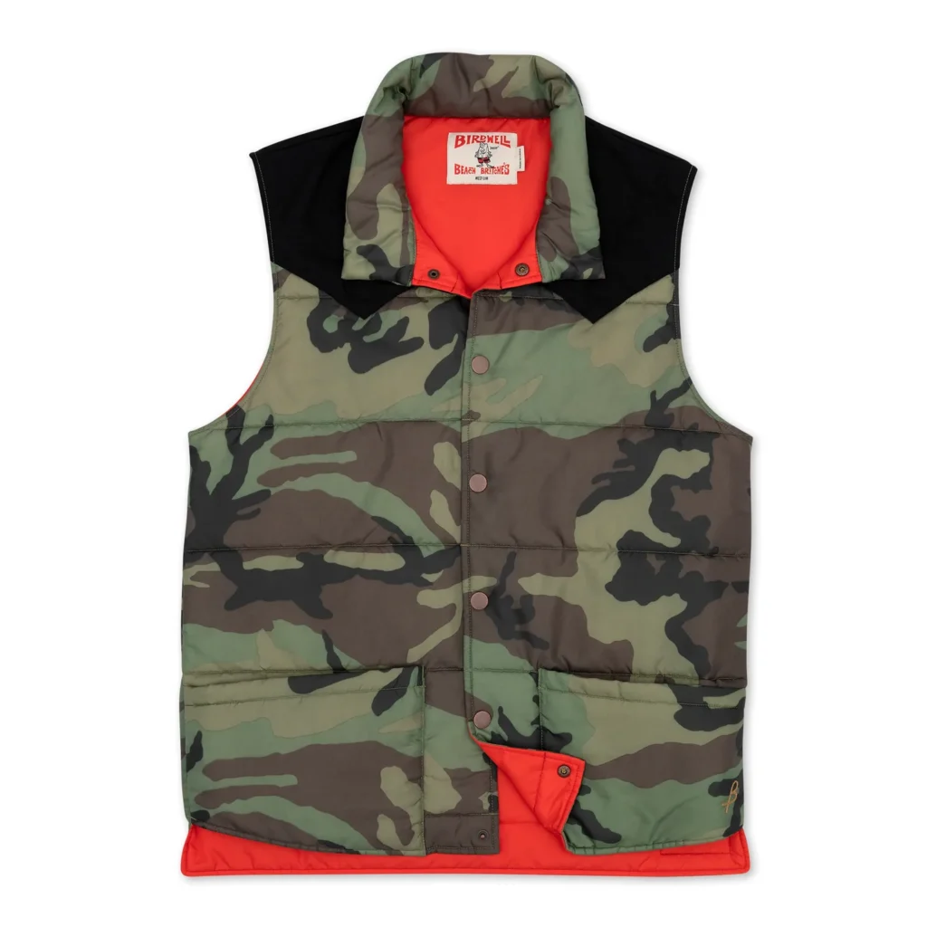 Woodland Camo SurfNyl™️ body, black cotton ripstop yoke, and paprika SurfNyl™️ lining. Filled with Primaloft™ insulation made from recycled material. Metal snaps, elongated tail, tonal logo patch, and chain-stitched “B” on hem.