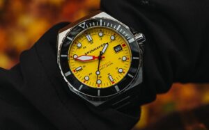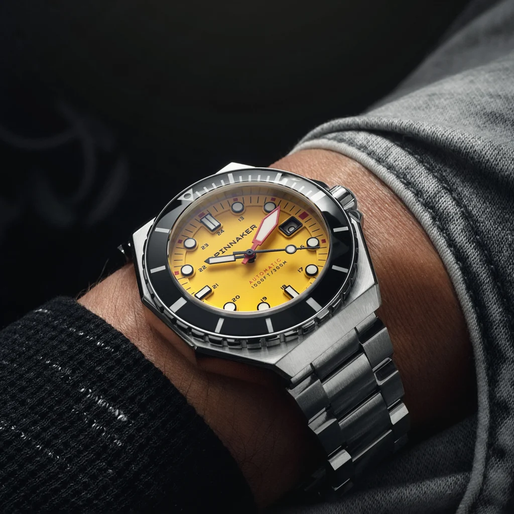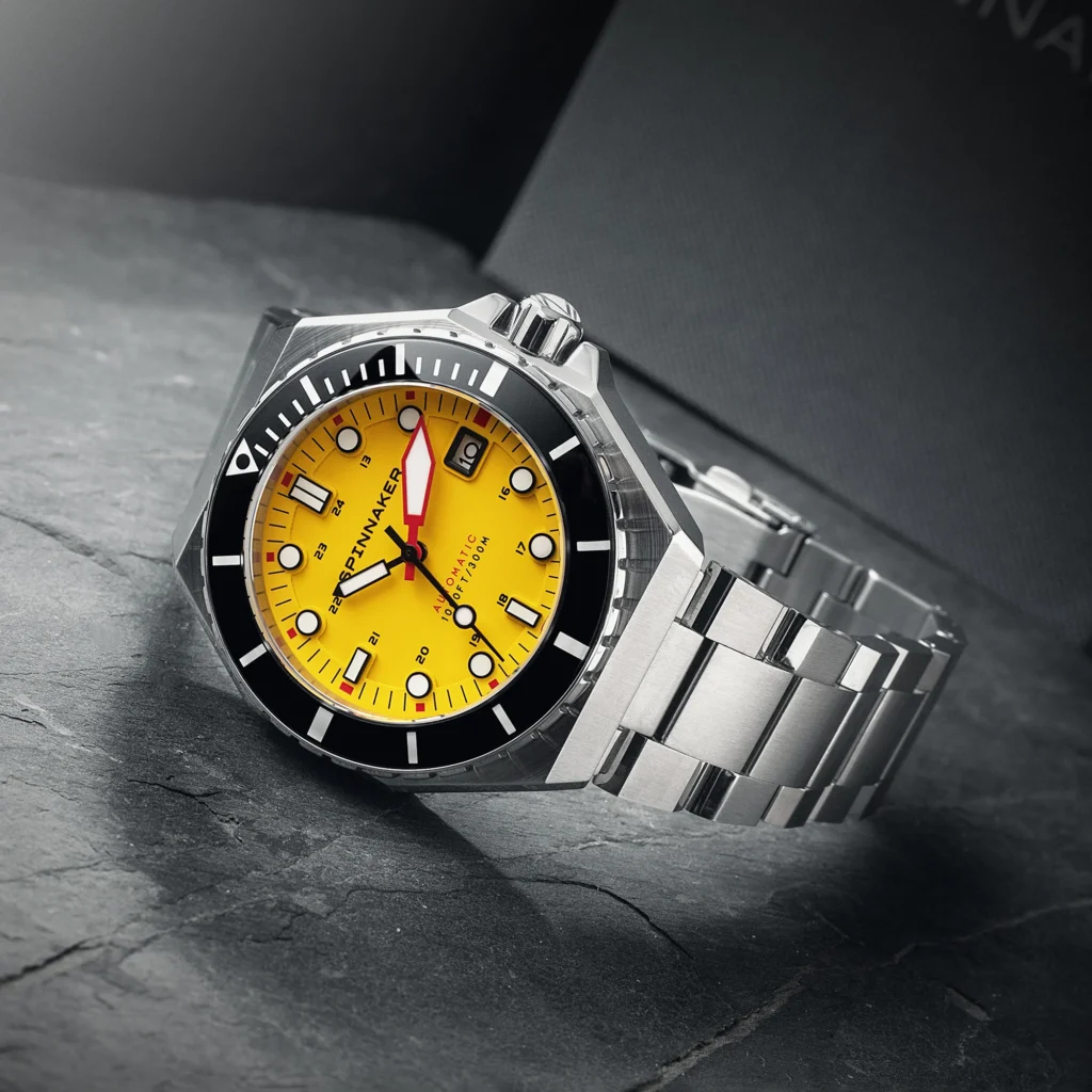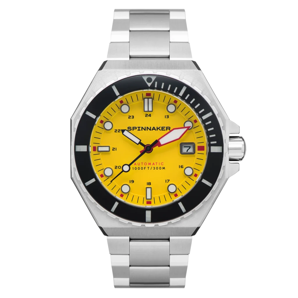 The Dumas leans heavily into this robust, industrial aesthetic. Housed in a bold, 44mm octagonal stainless steel case, it provides an uncompromising and sturdy frame for the imposing bezel and the vibrant yellow dial.