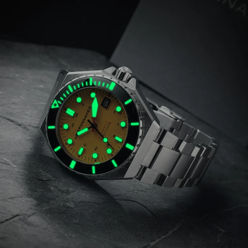 The dial features crisp, applied indices that are generously coated in premium Swiss Super-LumiNova. Whether you are exploring murky underwater realms or simply navigating a nighttime cityscape, this radiant luminescence ensures absolute clarity at a rapid glance.