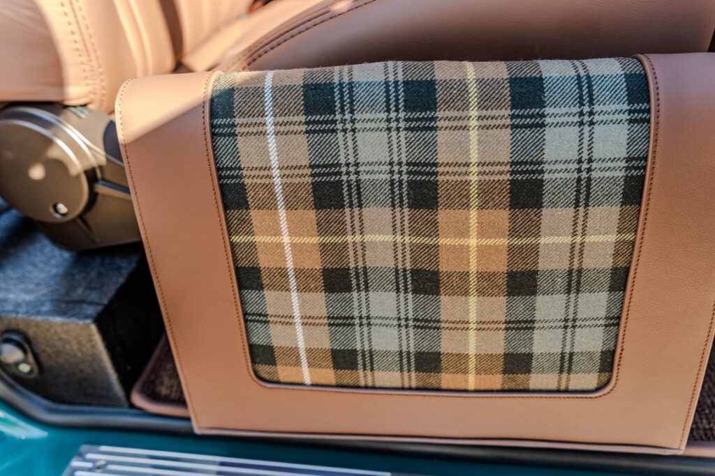 This stunning textile is beautifully complemented by custom-dyed stamped leather from Garrett Leather Transportation, a neutral Alcantara headliner, and hard-wearing square weave floor mats.