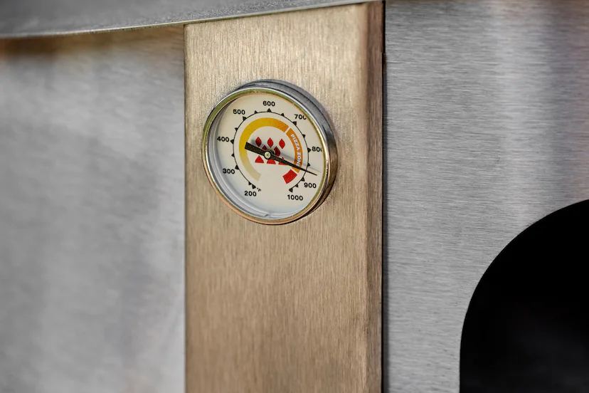 PRECISE TEMPERATURE MANAGEMENT: Enhanced temperature control is achieved with the pizza oven’s thicker stones that effectively retain heat beneath the pizza. The heat bypass chimney empowers you to regulate air temperature, a process easily monitored through the built-in thermometer located on the exterior of the pizza oven.