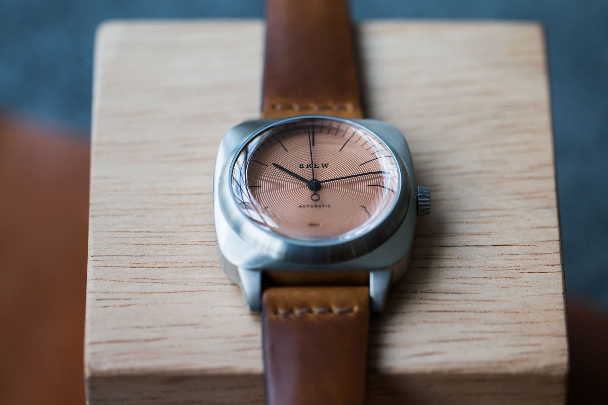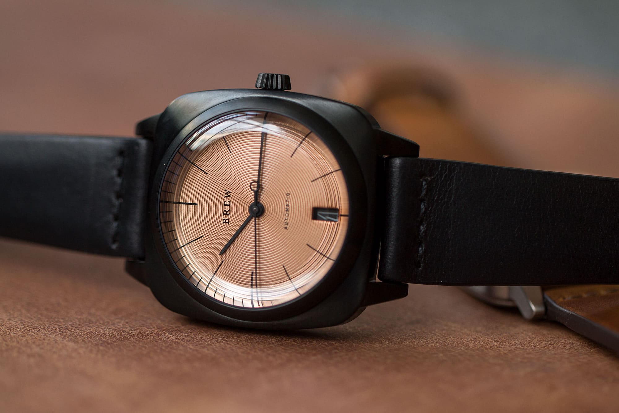 Contrary to typical graining methods, the lines are wide and deep, and this has the effect of giving the dial a cool, industrial feel which is an understated but knowing nod to Brew Watch Co’s conceptual source material for their watches – namely, coffee making equipment. The Brew x Worn & Wound HP-1 Limited Edition Watches boasts a 38mm rounded square dial with a thick bezel, circular dial aperture, short lugs and large domed crystal face – all of which delivers an aesthetic quite unlike any watch we’ve encountered before here at The Coolector.