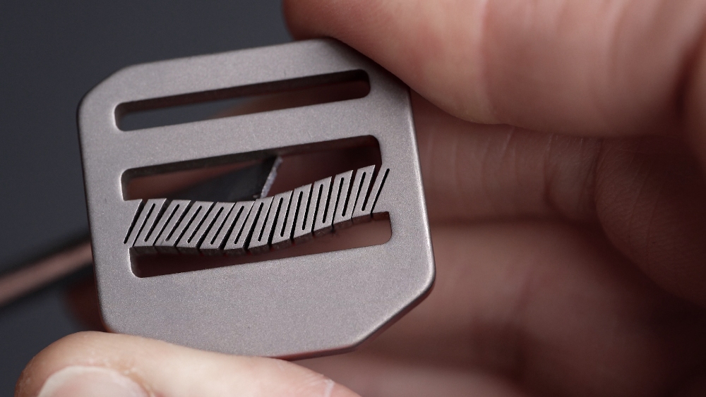 Designed in their London studio by an ex-Dyson engineer, these first-of-their-kind mechanisms are precision wire-cut from a single solid block of titanium using a highly technical process called electro-discharge machining.