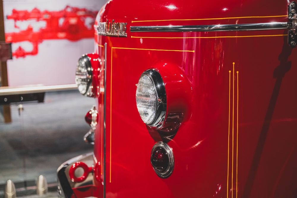 Visually, the truck is nothing short of arresting. Having undergone a high-quality older cosmetic restoration for the Corporate Collection, it presents in a brilliant, mirror-finish red that demands attention. The livery is accented with genuine 23k gold leaf decoration, a traditional flourish that adds a layer of regal elegance to this industrial workhorse.