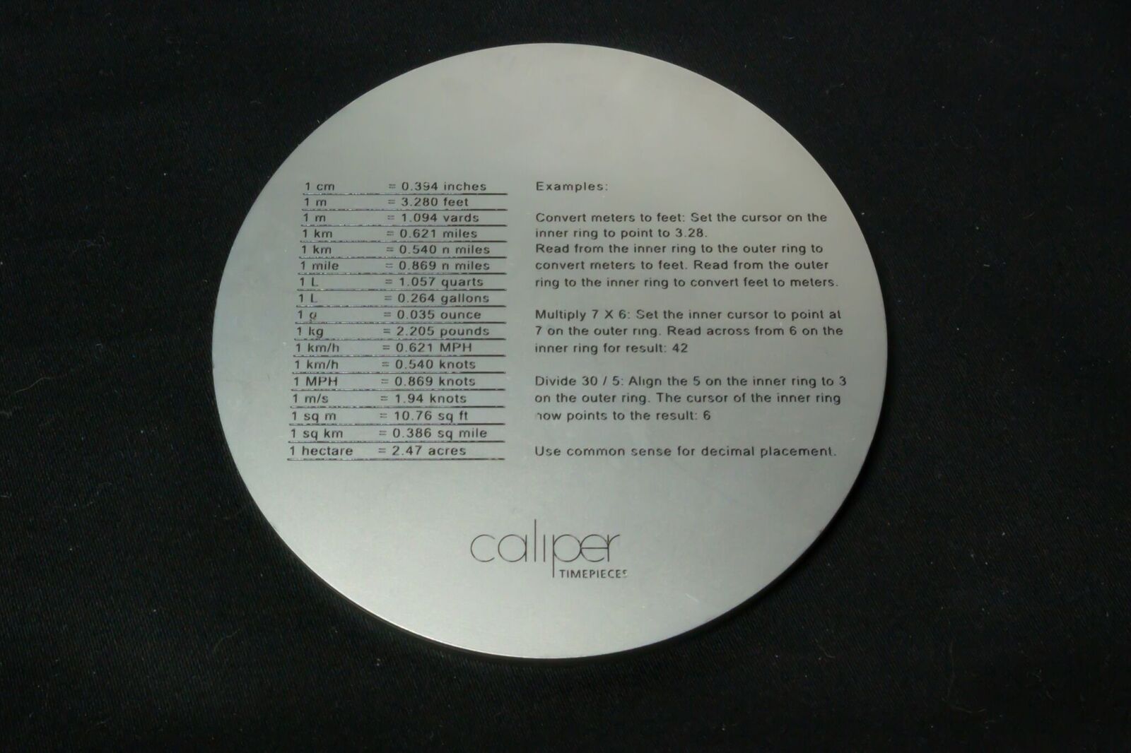 The Caliper Slide Rule Watch comes replete with a 3 inch (8 cm) circular steel slide rule which is more than enough to make simple measurements as and where you need them. In order to make sure you can fully capitalise on both the slide rules available with this cracking timepiece, they come with instructions on how best to use them. Because, truth be told, the use of a slide rule has increasingly become a lost art and few men today are going to be au fait with its usefulness.