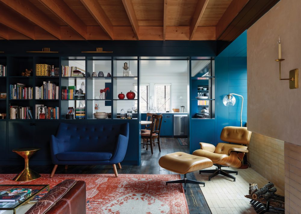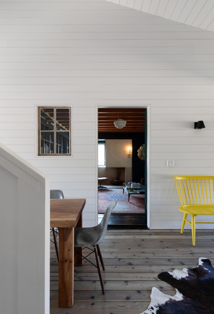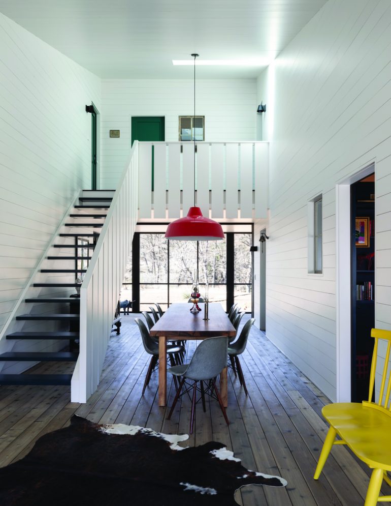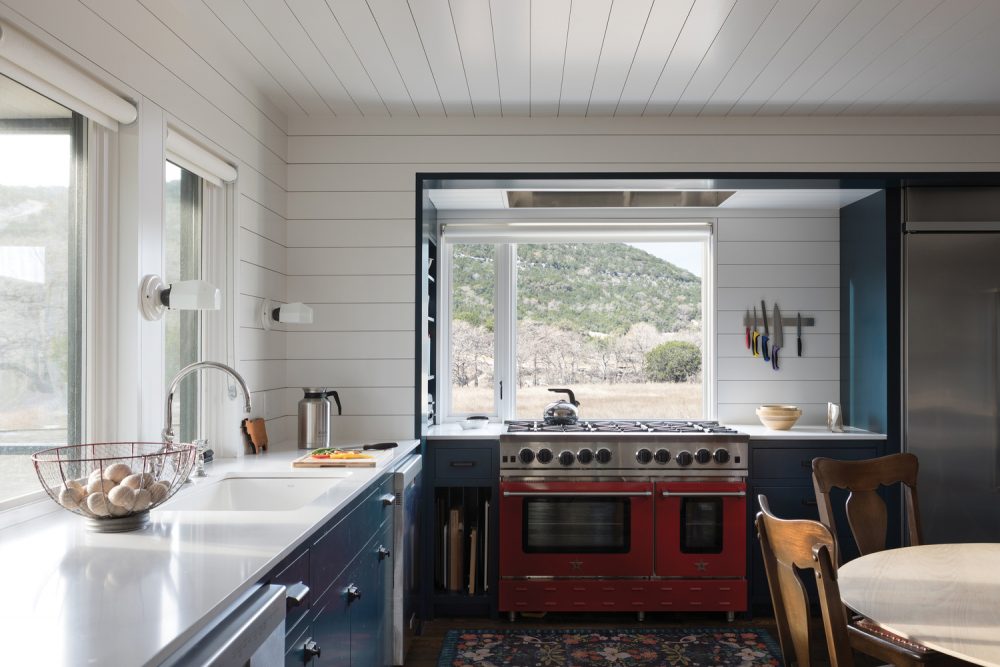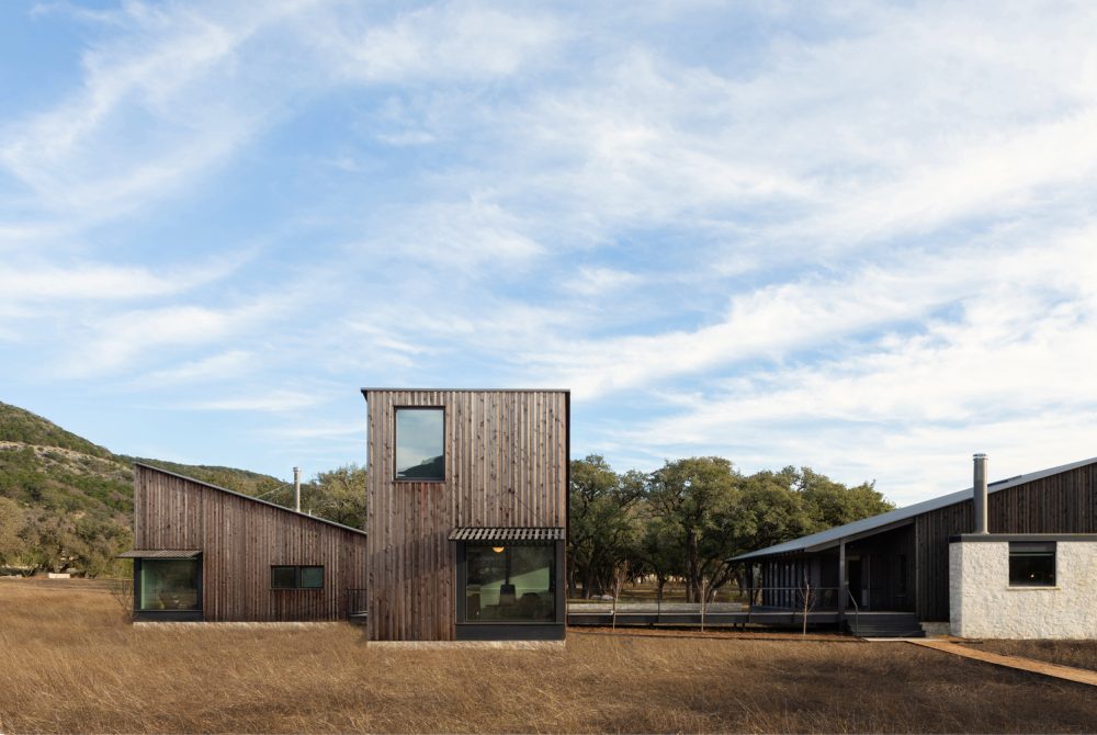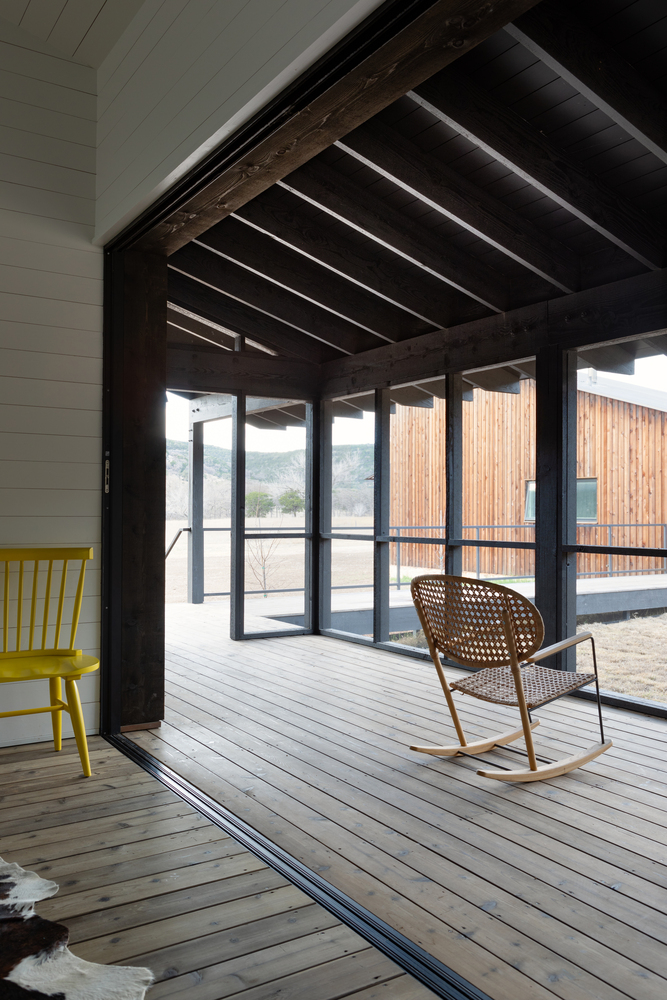 The main house and cottages of the Camp Frio Retreat are linked by a slightly elevated walkway which lets any barefoot kids to run back and forth over the tall grass and the bugs and creepy crawlies found within. Much in the same manner as “Dogtrot” shelters from the past, a “breezeway” bookended by concealed multi-slide doors, bisects the main part of the house and allows for alfresco dining most of the year. Alternatively, the space is zoned and can be enclosed for heating with screened porches, front and back, enveloping the cozy living spaces of the property.