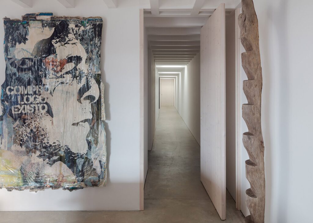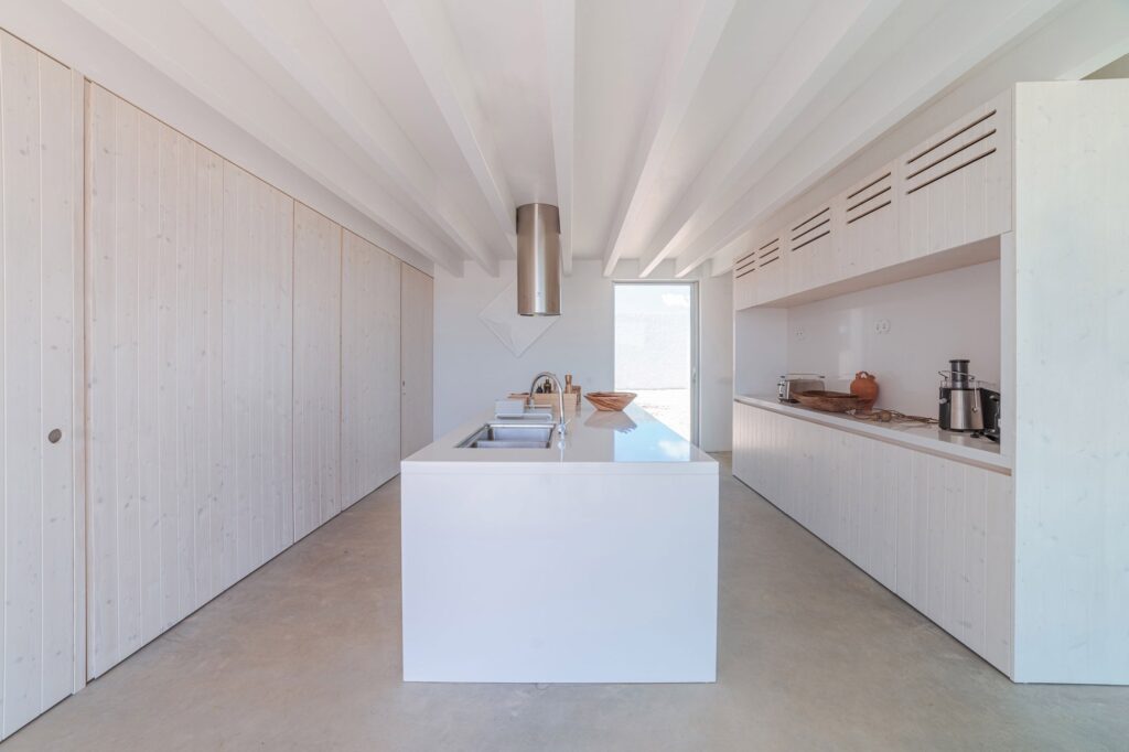 The third block at the western side of the Casa da Volta’s courtyard has a garage space and staff bedroom, and it is aligned with a route that leads through the corner gateway for car access. Appearing as an extension of the boundary wall, the blocks of the home have been given the same whitewashed stone finish, with chalk-painted concrete lintels above windows and openings for a pleasing, relaxing and restful aesthetic that we’re big fans of here at The Coolector. Inside Casa da Volta, brushed concrete floors and white rendered walls create understated, minimalist spaces, along with exposed wooden beams that are also painted white. The living area is designed as an “enfilade” of rooms, with pocket doors letting the living room, dining room and library to flow as one, centred around an eye-catching fireplace. Portuguese architecture perfection.