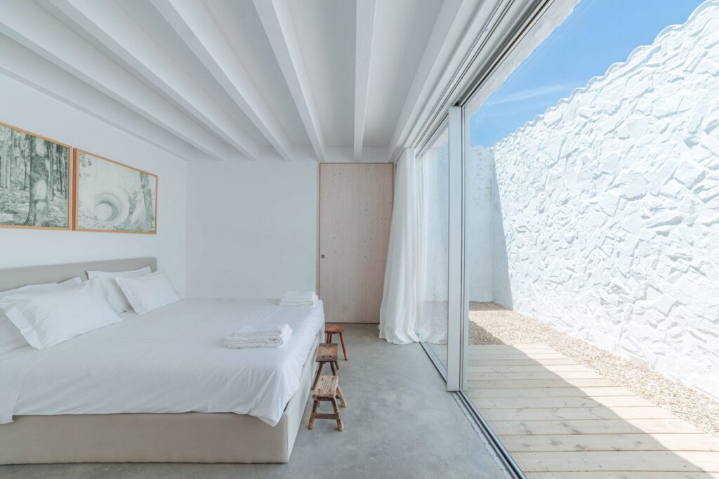 At the back of the courtyard for Casa da Volta from Promontorio is where you’ll find the bedroom block, a row of six simple en-suite bedrooms that are positioned off an elongated corridor. These bedrooms both look onto and have direct access to the property’s central courtyard through large glass doors. A block containing living, dining, kitchen and library spaces also runs along the eastern side of the courtyard, and this opens out onto a vast terrace which overlooks the the lovely landscape that leads down to a swimming pool.