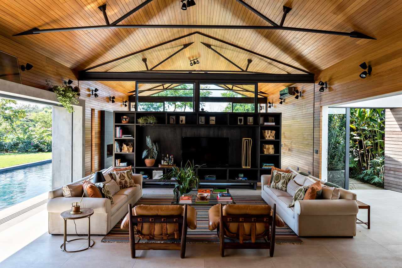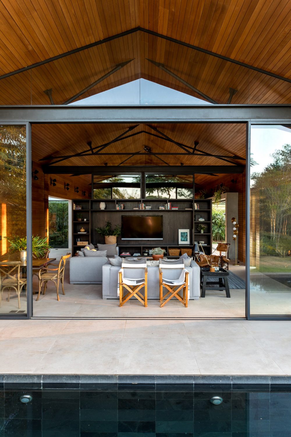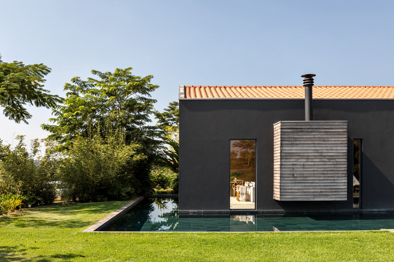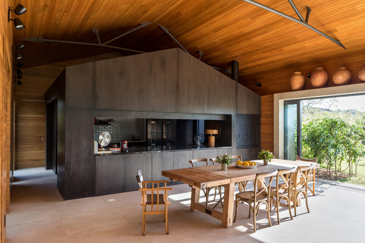 Given that the design of Casa Jordão is all about promoting social interaction, the living room feels vast with both sides opening out to make it ideally suited for family gatherings. A custom storage unit separates this space from the other side, which houses seating and a fireplace that open out onto the side pool. The kitchen of Casa Jordão resides in a mini house which has been finished off with darkened wood, which juxtaposes the light wood walls and ceiling of the main structure surrounding it.