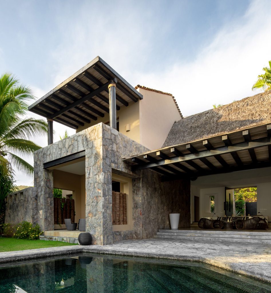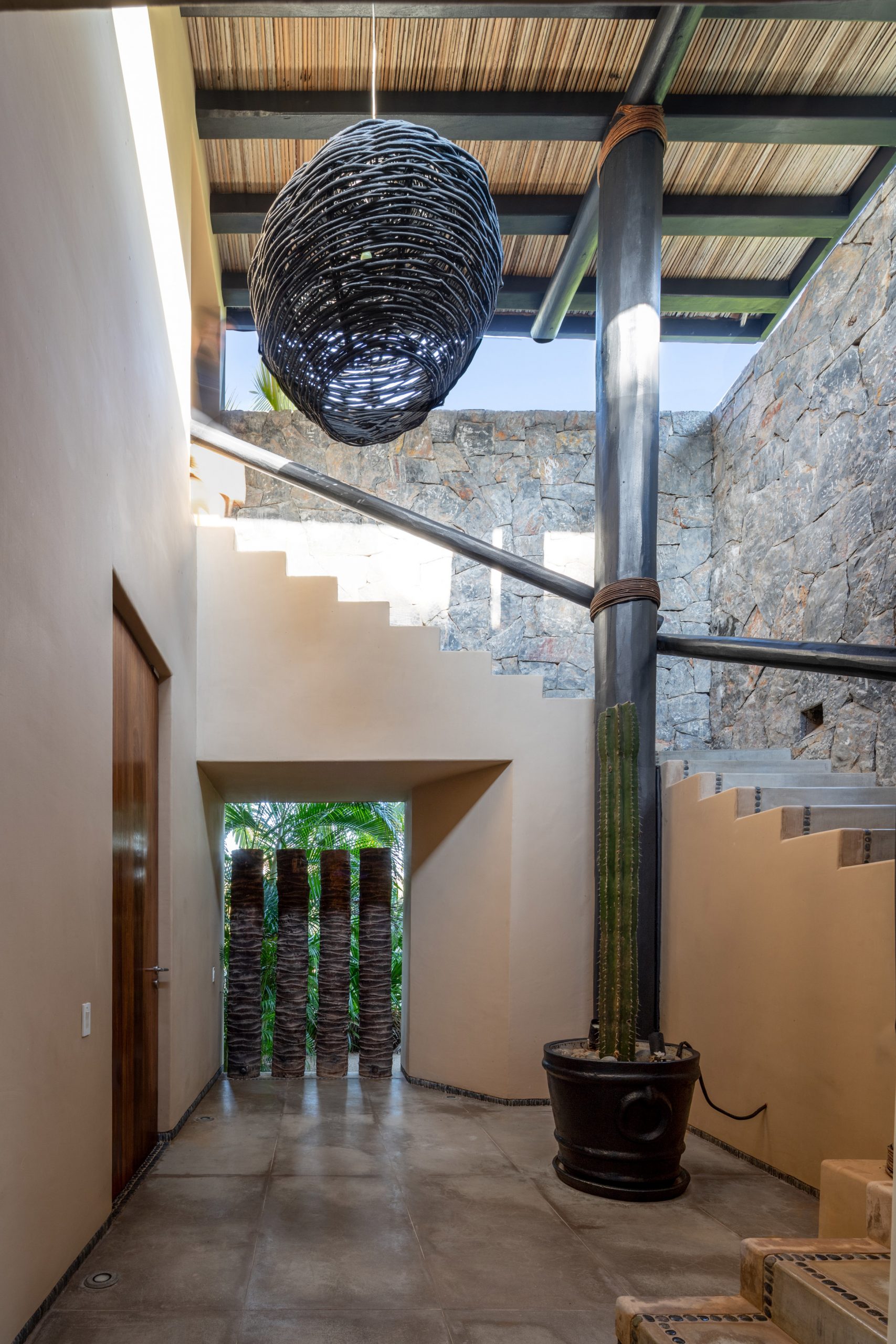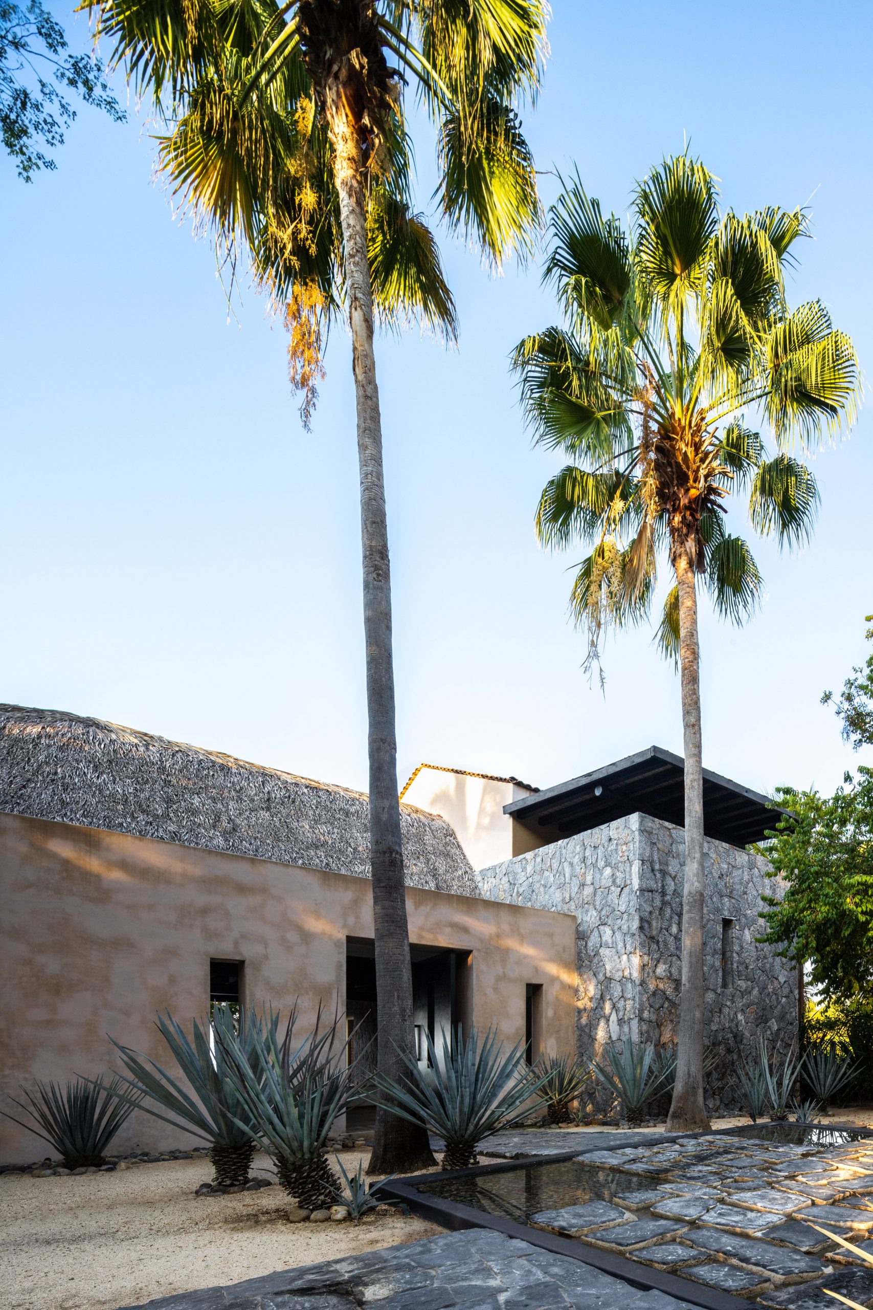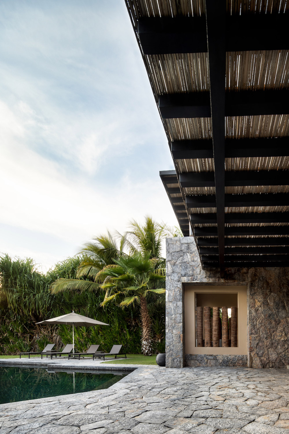 A wonderfully well crafted stone wall and lush greenery conceal Casa La Vida from the road and reveal only the dry palm roof of a central palapa, which is a gabled building made from dried palm leaves. This is something which are regularly used in the region because they deliver shelter, allow for natural ventilation and reduce solar absorption – whilst also ensuring the traditional aesthetic to this contemporary build.