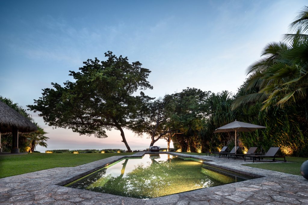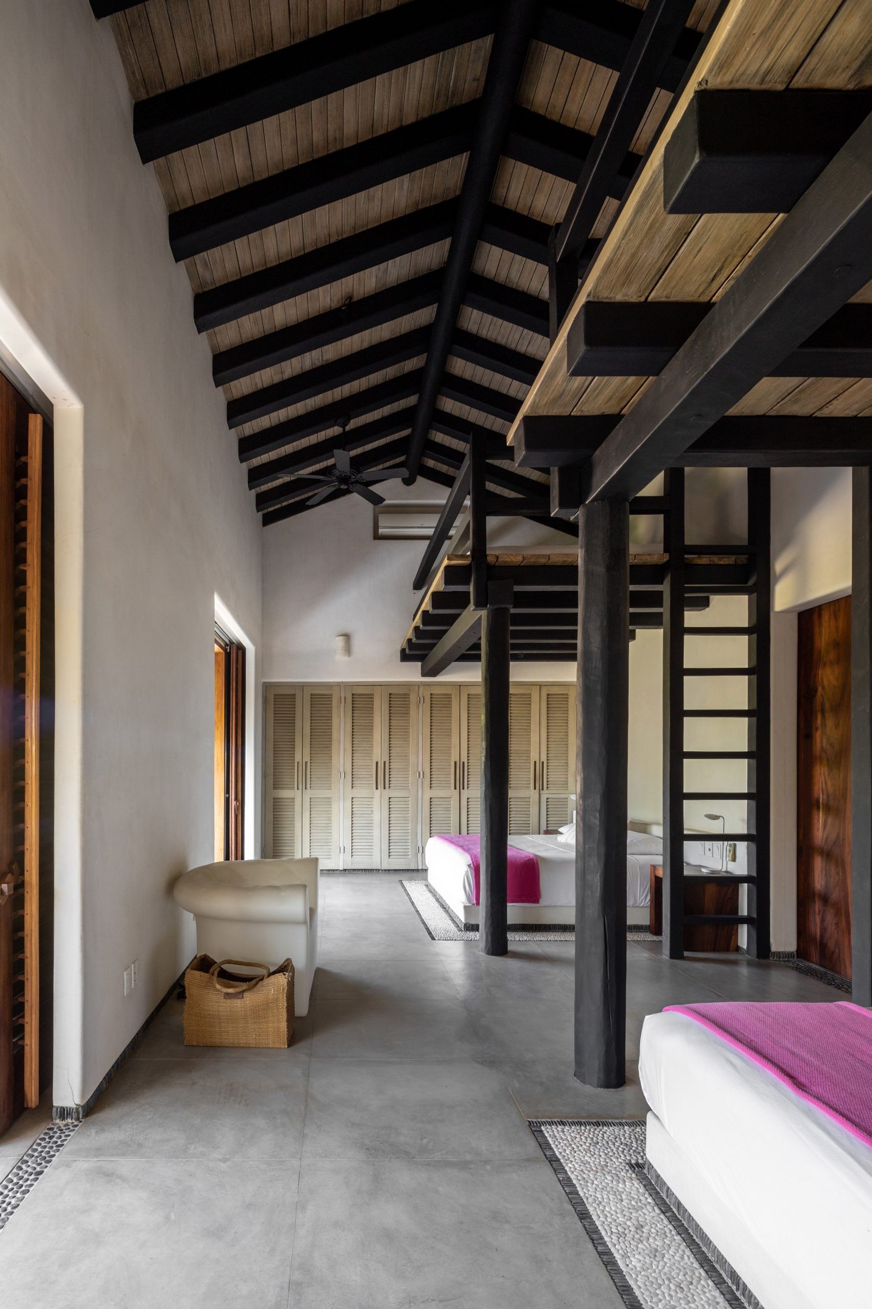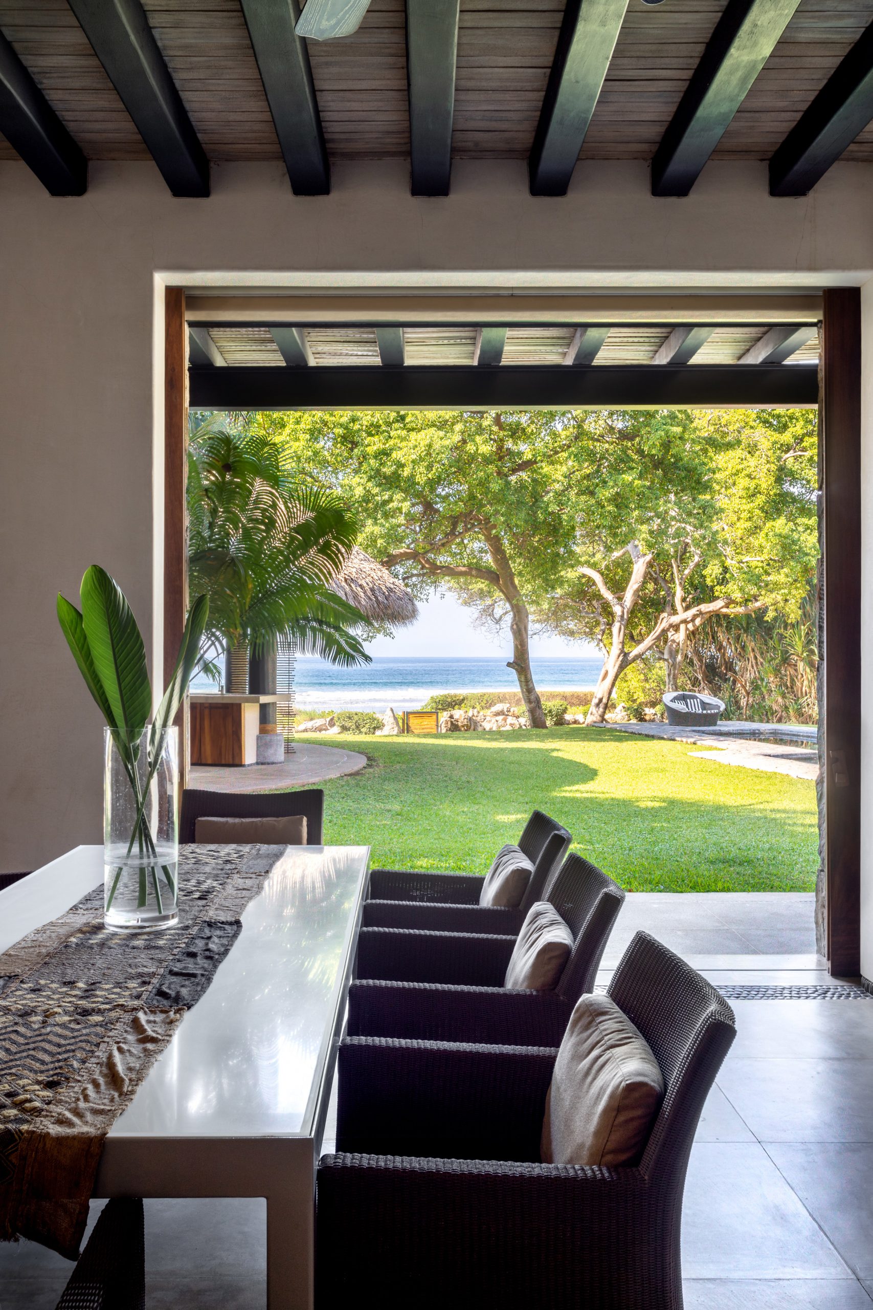 In Casa La Vida, the palapa is positioned to separate the residence’s two structures. One building houses the open kitchen and dining room while a large bedroom occupies the opposite end of the build. On the second floor, there are two other bedroom suites, each with an adjoining porch and under the thatched roof is the main living space and an additional dining area, which opens up to the backyard overlooking the pool and nearby beach.