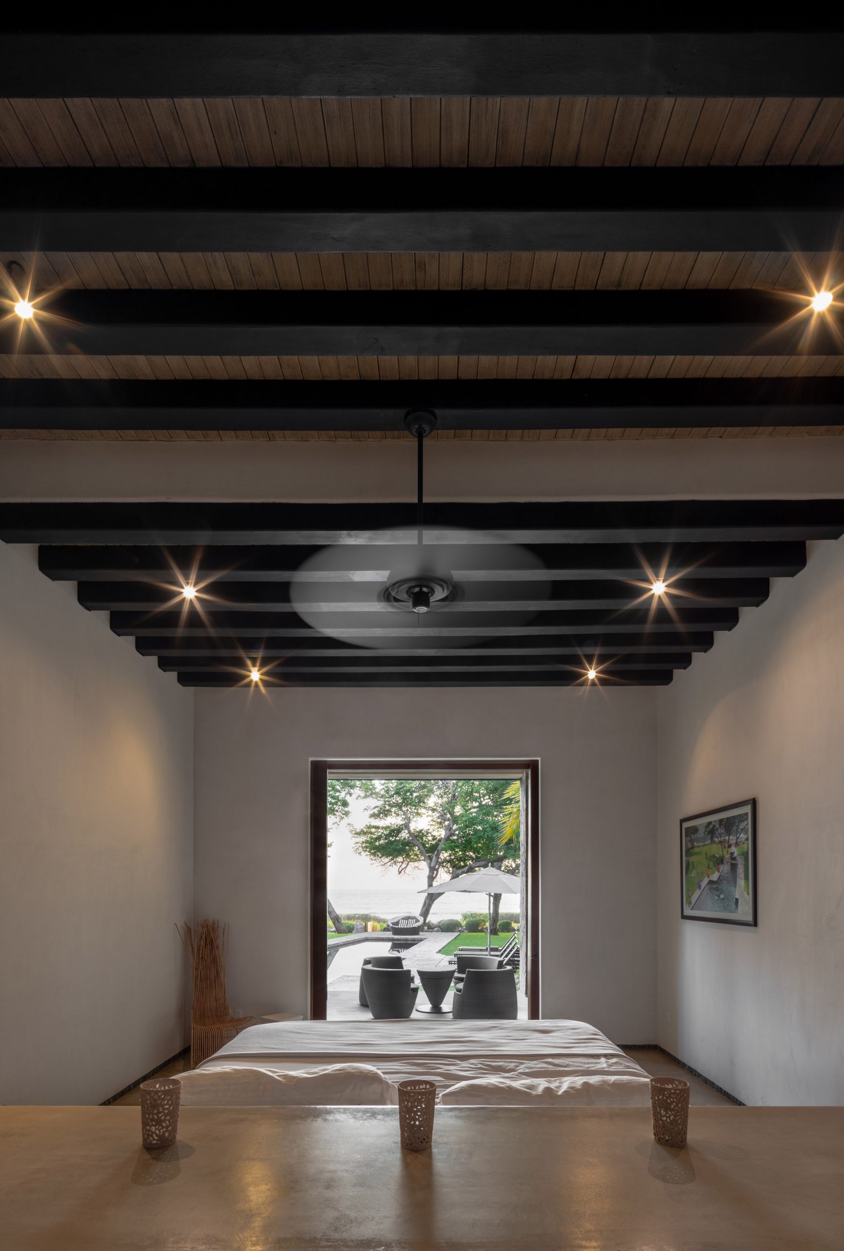 The various different types rocks dotted around the plot were taken from nearby rivers and also are used to form part of the exterior and the edging around the spectacular, geometric swimming pool. The architects have covered the floors within using polished concrete tiles and painted the interior walls white for the pleasing minimalistic vibe. Pebbles, cacti plants and palm trunks are positioned around the interiors as decorative elements on the windows and floors and finish off the aesthetic perfectly.