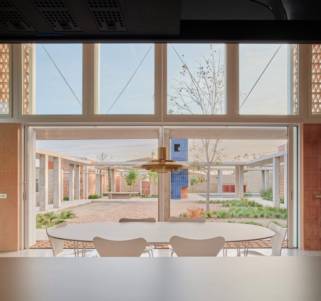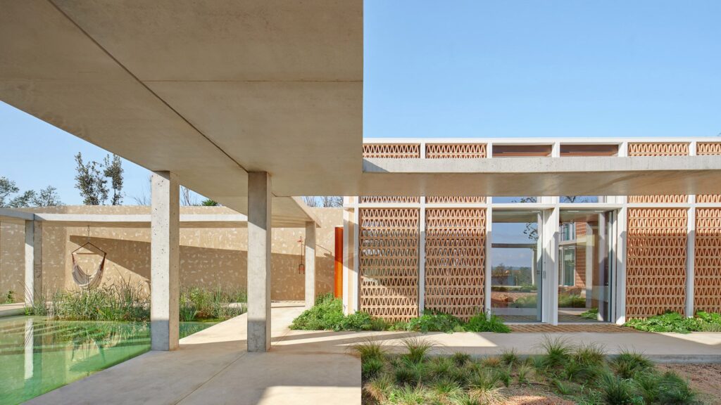 The material palette is a masterclass in contrasts, with Twobo Arquitectura describing it as a “dialogue between the industrial and the handcrafted.” The steel-framed and concrete structures are softened by screens of hollow brickwork and areas of hand-applied lime plaster, creating a beautiful tension between raw strength and artisanal warmth. This theme continues inside, where exposed, white-painted steelwork and glossy concrete floors are balanced by the warmth of dark wood ceilings and custom-built storage.