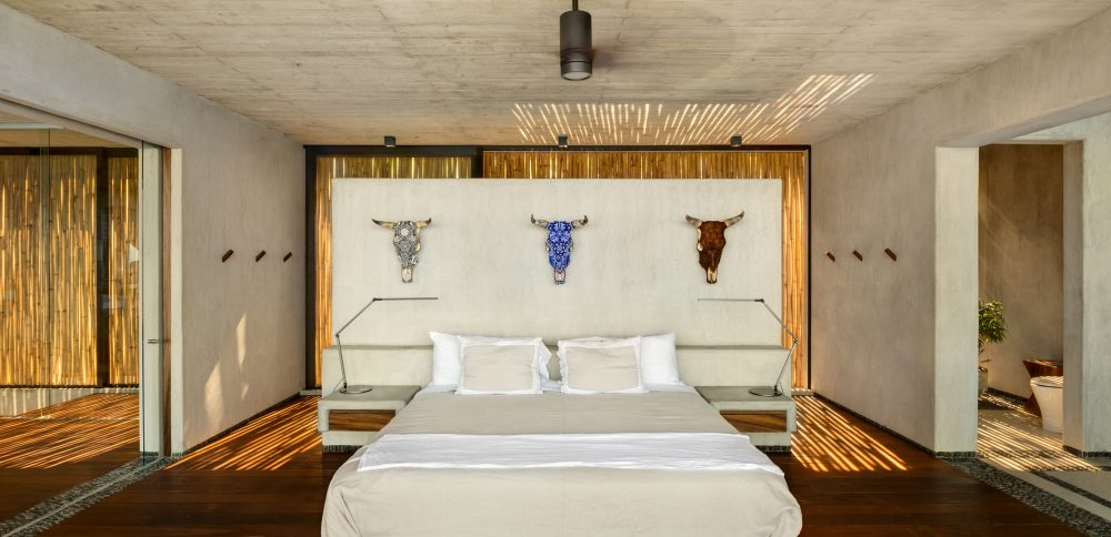 The open-plan kitchen, living and dining spaces in Casa Z head out onto a terrace which provides spectacular views of the water, and where you’ll find an infinity pool that creates the illusion of a continuous body of water just outside the home. In this area of the home you’ll find wooden furniture and verdant plants which are in direct contrast to the home’s exposed structural elements. There is an exterior staircase which leads to the guest bedrooms, one floor down and there are two bedrooms to be found on this floor, each of which boasts a small terrace and an en-suite bathroom.