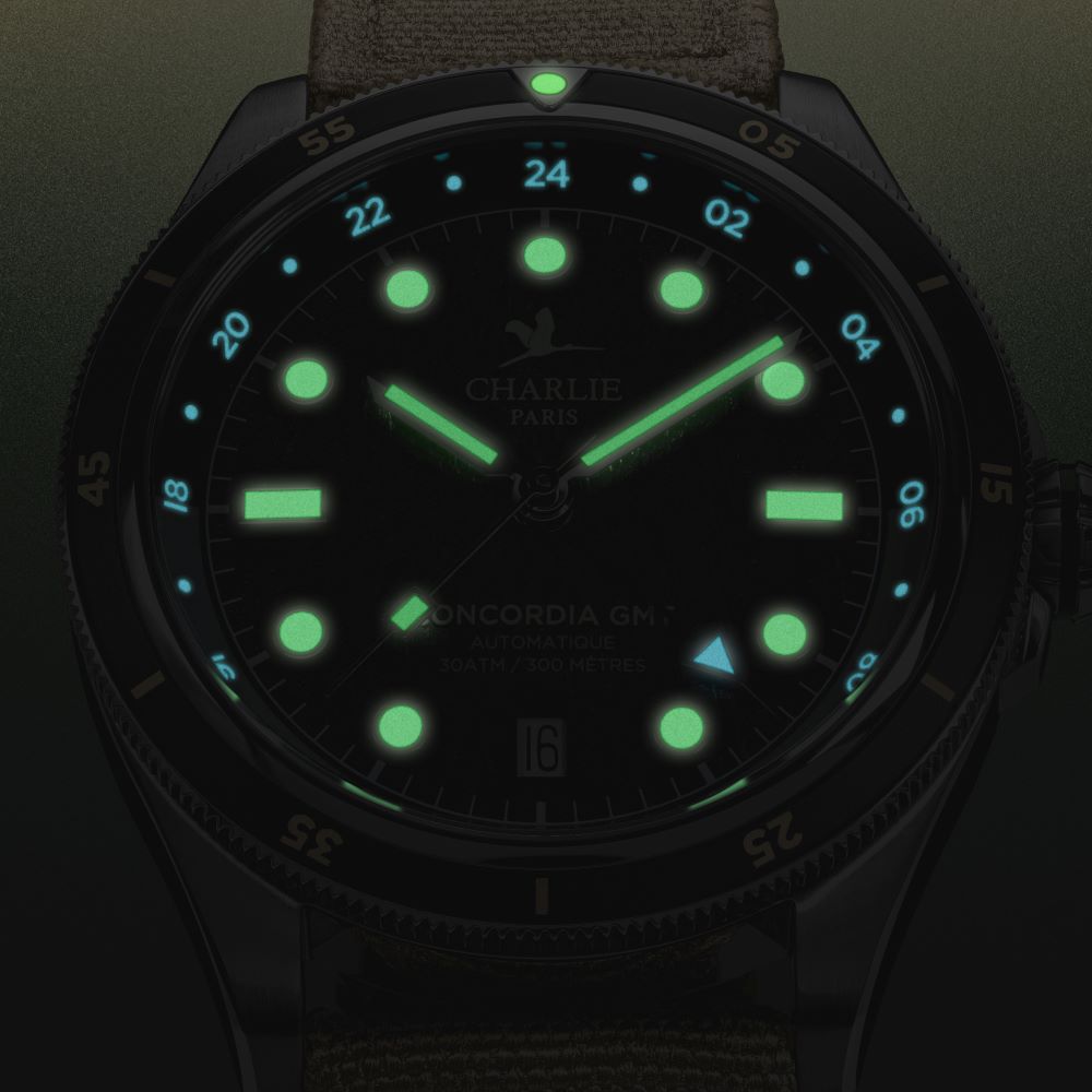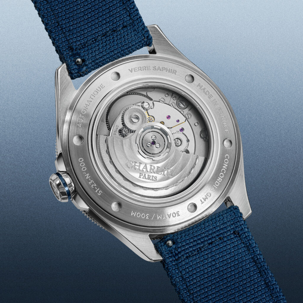 The caseback on the Concordia GMT is screw-down and transparent, which is great because it does an excellent job of revealing the intricate movement, whose weight is signed Charlie Paris. The glass is domed sapphire, anti-reflective, and 3mm thick adding that extra bit of resilience to proceedings which is important for a watch geared towards outdoor adventures. The crown is screw-down (30ATM) with eloxed aluminium insert. A red insert on the stem indicates if the crown is properly screwed in. Love no-nonsense timepieces that hit the mark from an aesthetic perspective? The Concordia GMT will be right up your street.