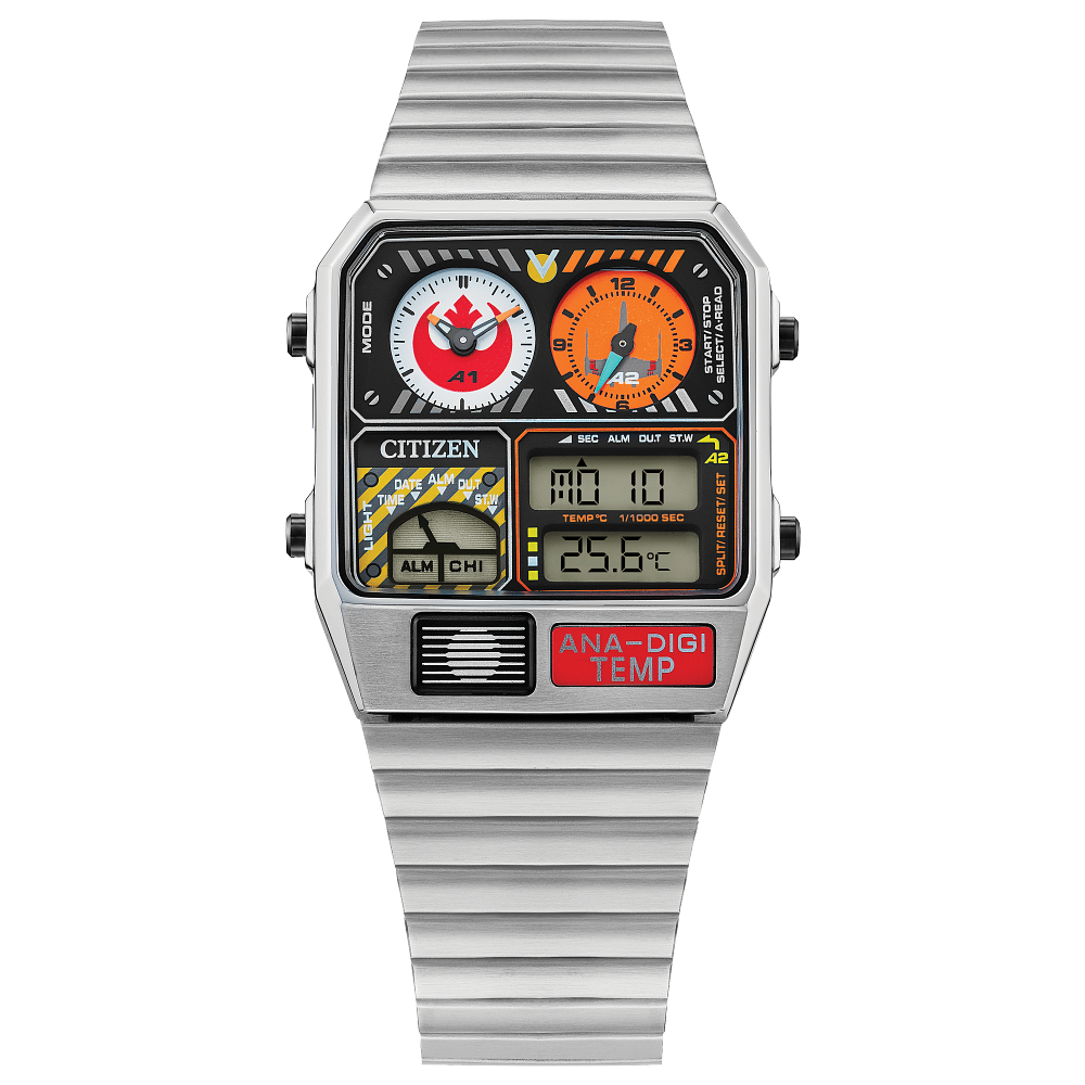 Star Wars™ fans new and old will want to be part of the action with this exclusive Trench Run watch from Citizen. It takes its inspiration from an original Citizen analog-digital timepiece from the 1980s, it features a rectangular black stainless steel case, with a feature packed dial, including dual time in both X-Wing and Tie Fighter Pilot views, an alarm, the digital time, and the temperature, making it a unique and stand-out timepiece.