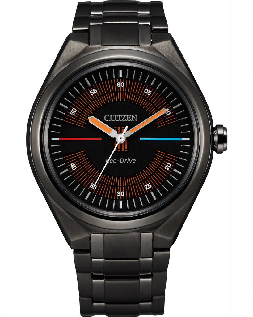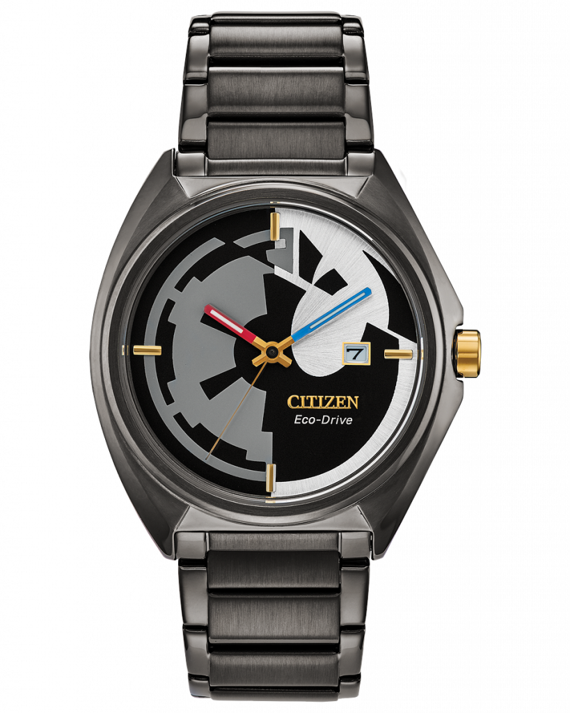 The case back shows off the ultimate battle between good and evil and the most memorable duel in the Star Wars™ story- Luke Skywalker and Darth Vader. Dark grey ion-plated stainless steel on the case and bracelet are accented with touches of gold-tone on the crown and hands. This watch is powered by Eco-Drive technology as well so no need for a battery. ($260)