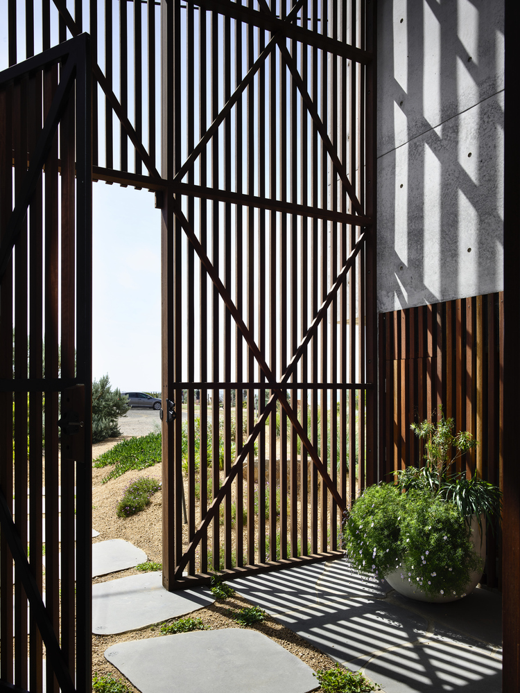 In addition to perching over the dune escarpment, the Cliff House also sits adjacent to a public beach car park. A key element of the design was the interface with this public realm, which saw the architects seeking to engage with, whilst retaining a degree of privacy for the owners. There is no fence to the public domain, just the edge of the house itself, and they have broken down the mass of the building to this side, opening up to the public through a large portal opening over the garage with a dune roof garden that will mature and eventually merge with the landscape surrounding the property.