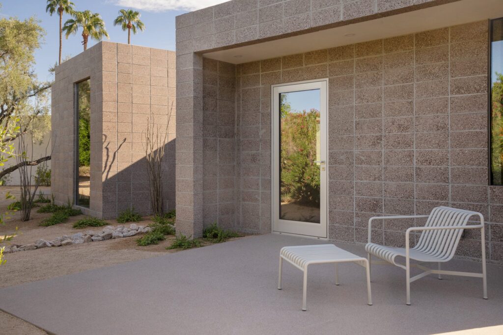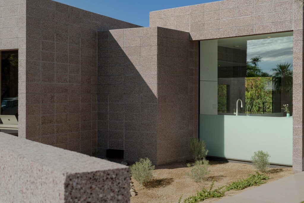 The entire structure is constructed using grey concrete masonry units (CMU), which serve as both the rugged exterior facade and the highly refined interior finish.