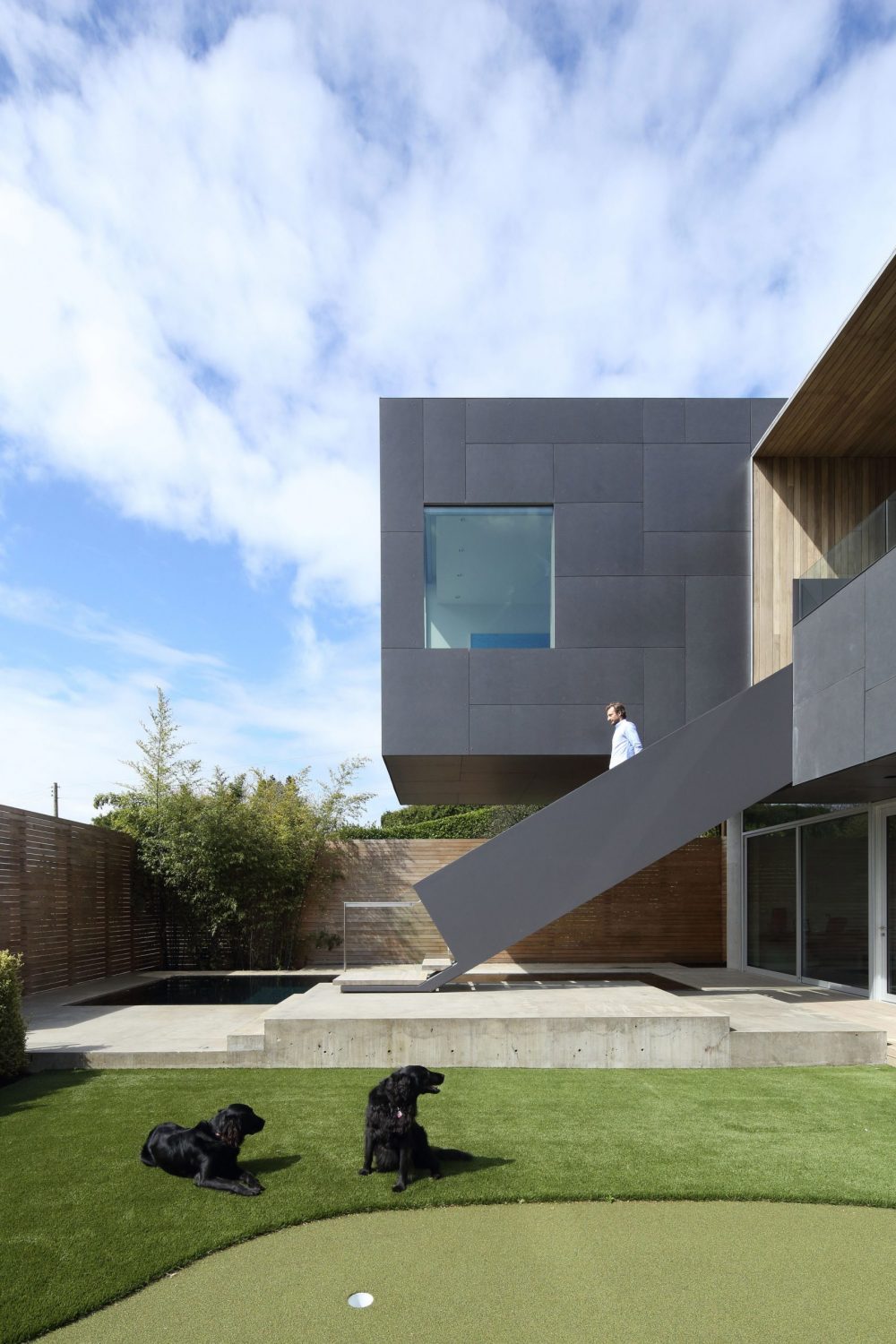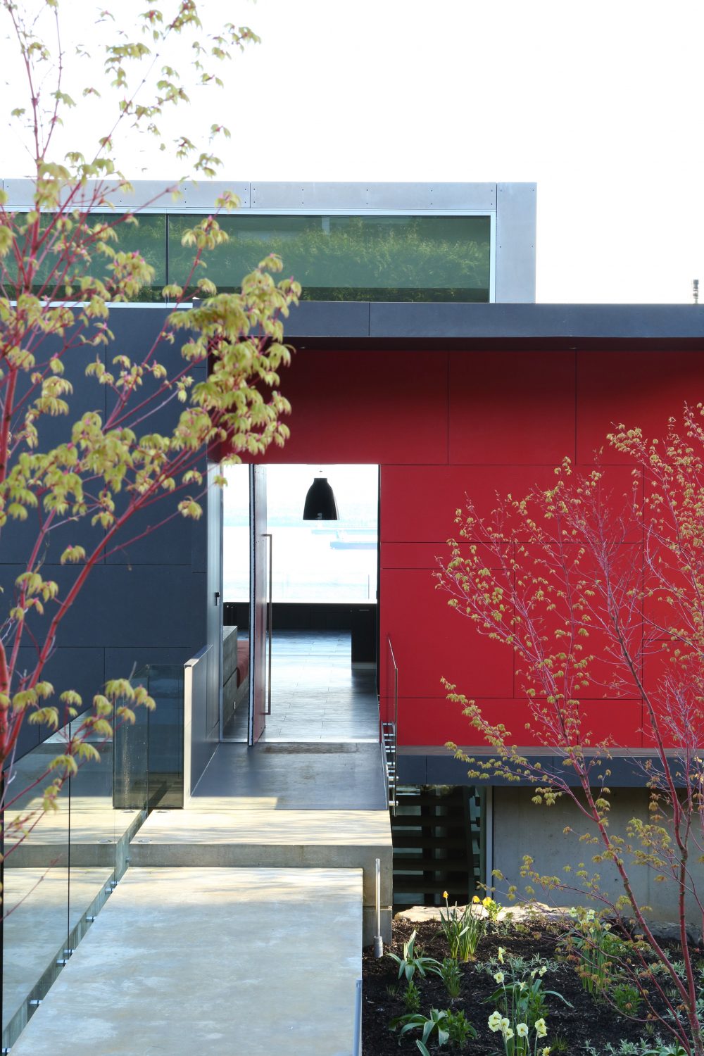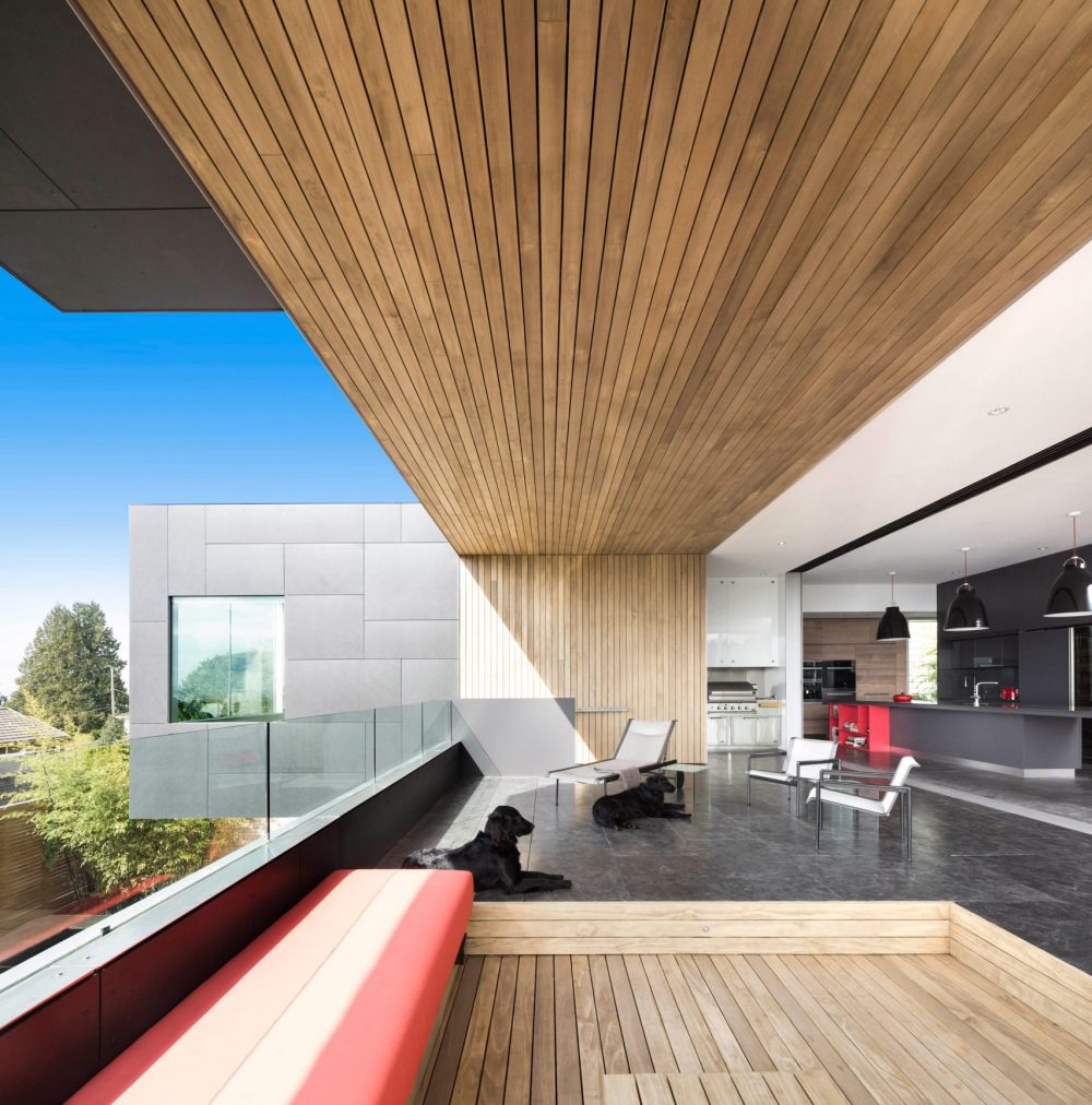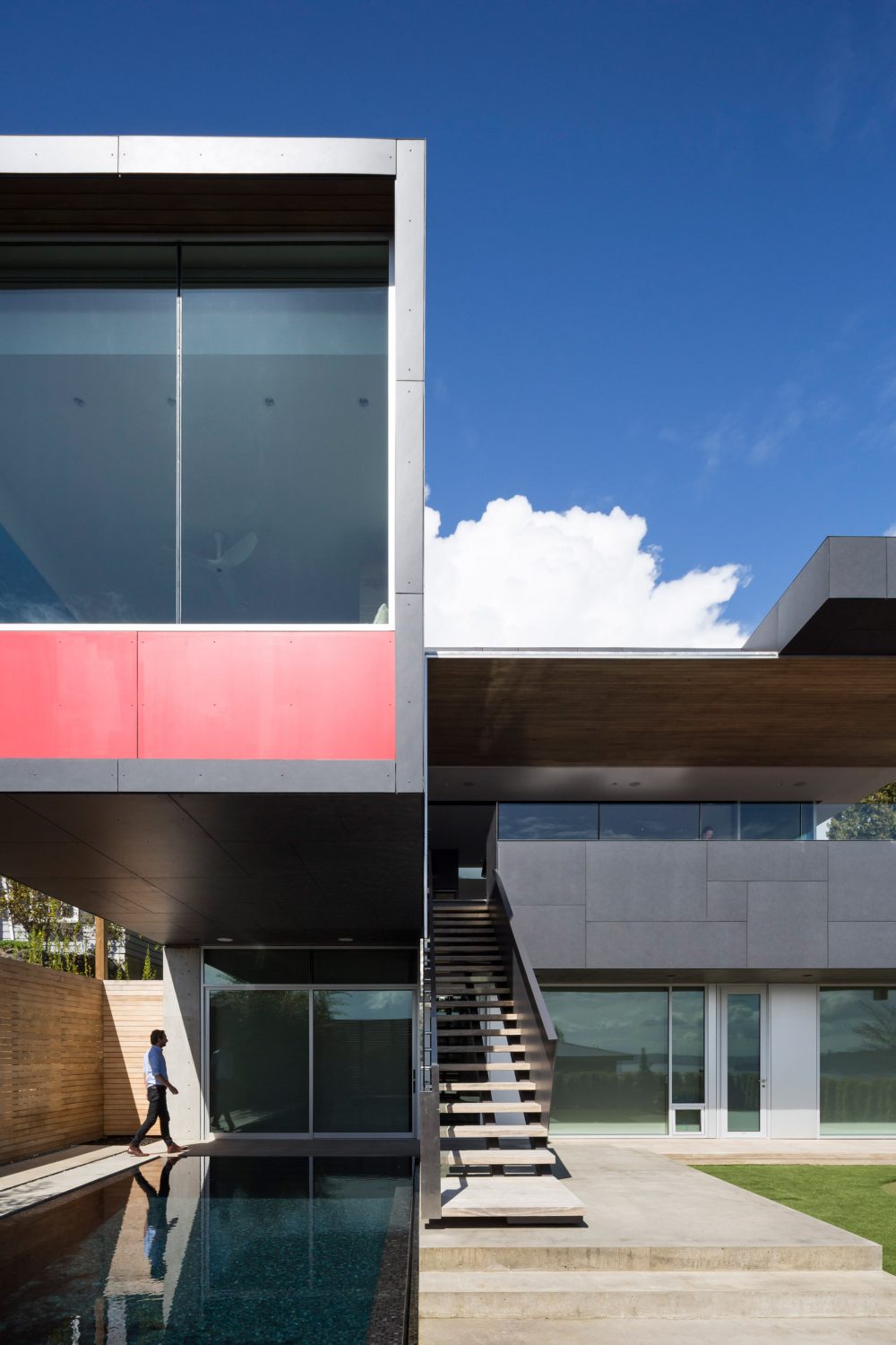 McLeod Bovell created a striking and contemporary 312-square-metre home which consists of rectilinear volumes, with exterior walls which have been painstakingly wrapped in grey cement-composite panels in a custom pattern to provide a compelling aesthetic impact. On the street-facing facade of the Container House, there is a wall wrapped in red-painted aluminium which provides the home a vibrant visual look and feel.