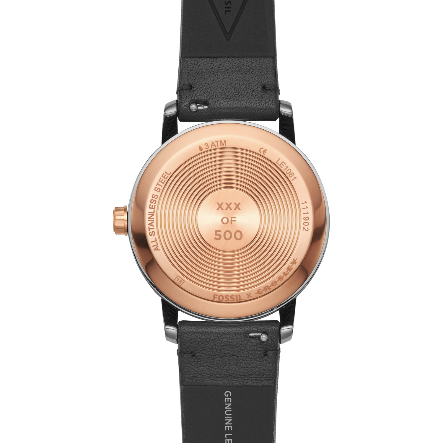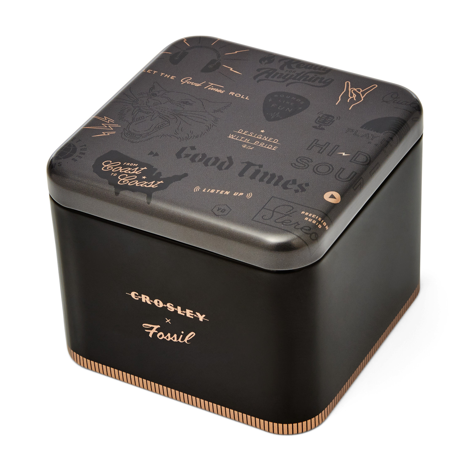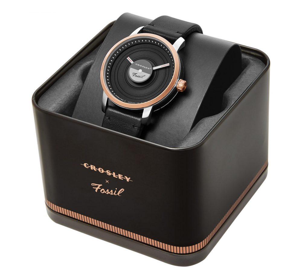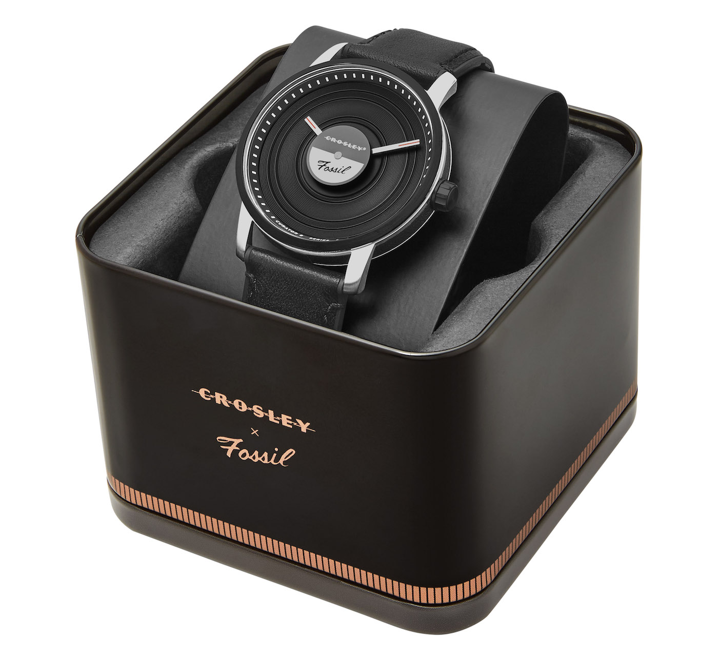 There is a distinctly vintage vibe to the Crosley x Fossil Watches that immediately adds to their appeal and each of the limited edition timepieces has a 1950s-style package in black, cool grey, and rose gold printing. An extra touch of cool comes from the fact that the packaging coordinates perfectly with the special edition record player that is being released alongside the two watches. They take their design inspiration from Crosley’s iconic turntables and the dials are grooved like a record, and the hour and minute hands are topped by a neat seconds indicator that is a circular disc designed to resemble the centrally located label of a vinyl record.