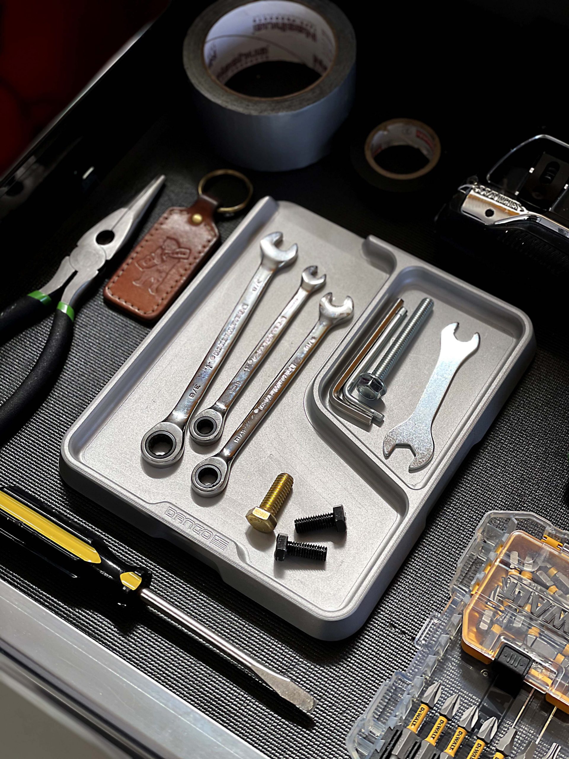 Each one of these superb side trays from DANGO is CNC machined out of 6061 Aerospace Aluminium which provides a product of tangible quality. This hefty side tray comes equipped with anti-slip rubber footings on the underside to help protect work surface and keep it safely in place. It has the same hight as the larger EDC Tray so they both work together in unison. This option comes included with a removable layer of DTEX pads for extra protection.